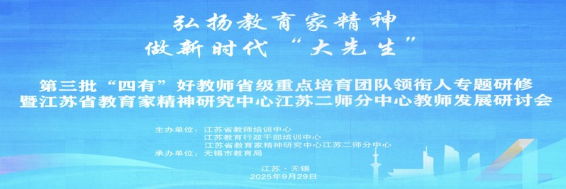 近日,由江苏省师干训中心、江苏省教育家精神研究中心江苏二师分中心主办、无锡市教育局承办的“第三批‘四有’好教师省级重点培育团队领衔人专题研修暨江苏省教育家精神研究中心江苏二师分中心教师发展研讨会”在无锡成功举办。