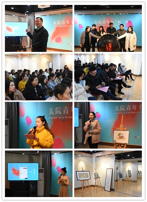 12月5日下午,美术学院在草场门校区艺术体育综合楼五楼展厅举行2018美术学院“一院一品”项目“美院青年有‘画’说”露天画廊开幕式暨“77号店”上线发布仪式。副校长祝兴成,宣传部部长李安林、招就处副处长司南、团委副书记刘姝,美术学院党总支书记丁莹、副院长路明和副院长陶金鸿出席仪式。