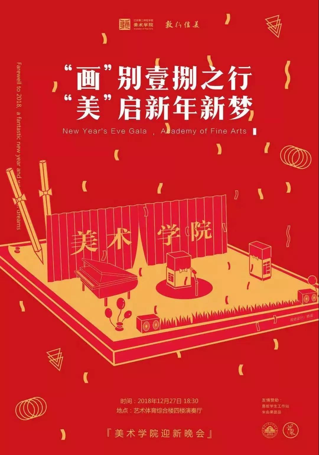 为迎接新年的到来,展现美院学子风采,2018年12月27日晚,美术学院“‘画’别壹捌之行,‘美’启新年新梦”迎新晚会于18:30分在江苏第二师范学院艺体楼四楼演奏厅精彩上演。