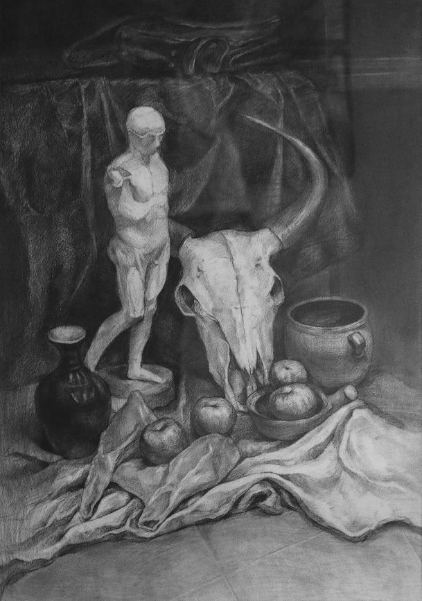 倪馨雨同学的这幅素描以写实为造型理念,以复杂多变的黑白灰层次关系表现对象,此画最大的特点在于整体明暗氛围的把握,光影关系处理很好,营造出强烈的视觉印象。它的黑白关系是概括的,是有节奏感的,正是因为明暗节奏感的呈现,画面艺术表现的形式美感出现了,整幅画气氛静谧而庄重。