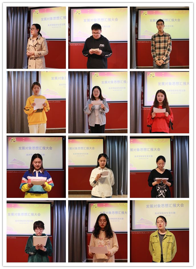 随后各发展对象依次上台进行了思想汇报。通过汇报了解到,各发展对象都能积极主动地学习党政知识,在理论上不断充实自己,通过各种现代通讯手段加强思想建设,紧跟党的脚步。在学习上,近期大部分发展对象都能在专业或者理论学习上取得不错的成绩,成为身边人的榜样和带头人,他们也明确表示在未来依旧会脚踏实地,以更高标准要求自己。在工作上,他们都在班级和美术学院学生会负责各项工作,对班级事务和学生活动都能积极参与,主动帮忙,协助老师圆满完成各项活动。在生活中,他们也能与同学友好相处,虚心听取周围同学的建议,做到时刻反思检查自身的不足。同时各发展对象也积极参与校内外各种志愿活动。