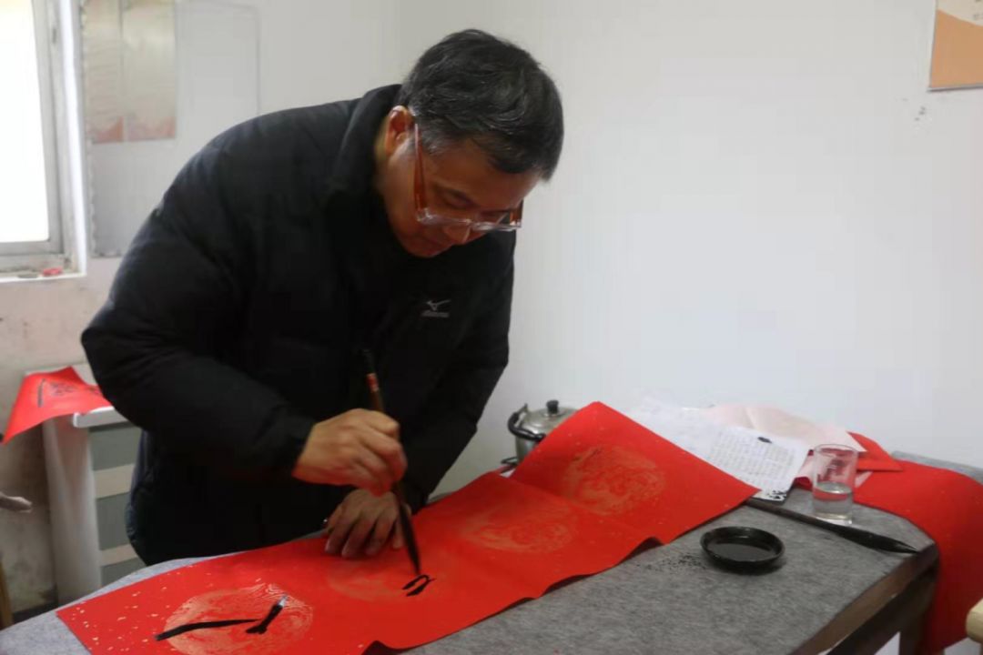 活动伊始,随行的前辈老师们就拿起毛笔,铺纸摆砚,挥毫泼墨,助力写春联的活动;学生们也迅速进入状态,一幅幅对联、一张张福字,充满着同学们对新年的美好期待和对村民的深深祝福。活动现场被村民们围的水泄不通,争相领取春联。