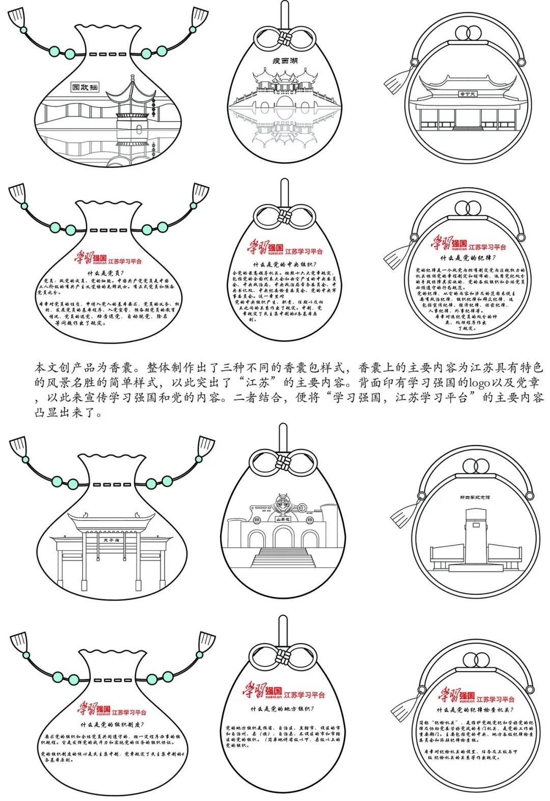 本文创作品主体为“香囊”。本作品整体使用了三种不同的香包样式,使物品本身更加具有挑选性。香囊上的主要内容为江苏各地具有特色的风景名胜,本作品选用了“拙政园”“瘦西湖”“天宁寺”“夫子庙”“花果山”“新四军纪念馆”这六处名胜作为刻画对象,以线条为主描绘出其简单样式,不仅简洁明了,而且突出“江苏”这一主题。其背面印有学习强国的logo以及党章的部分内容,与香包本身相结合,以达到宣传学习强国和党章的目的,并且契合“学习强国”这一主题。二者结合,既达到了美化的效果,又有实用性,还贴合主题,成为一件完整的作品。