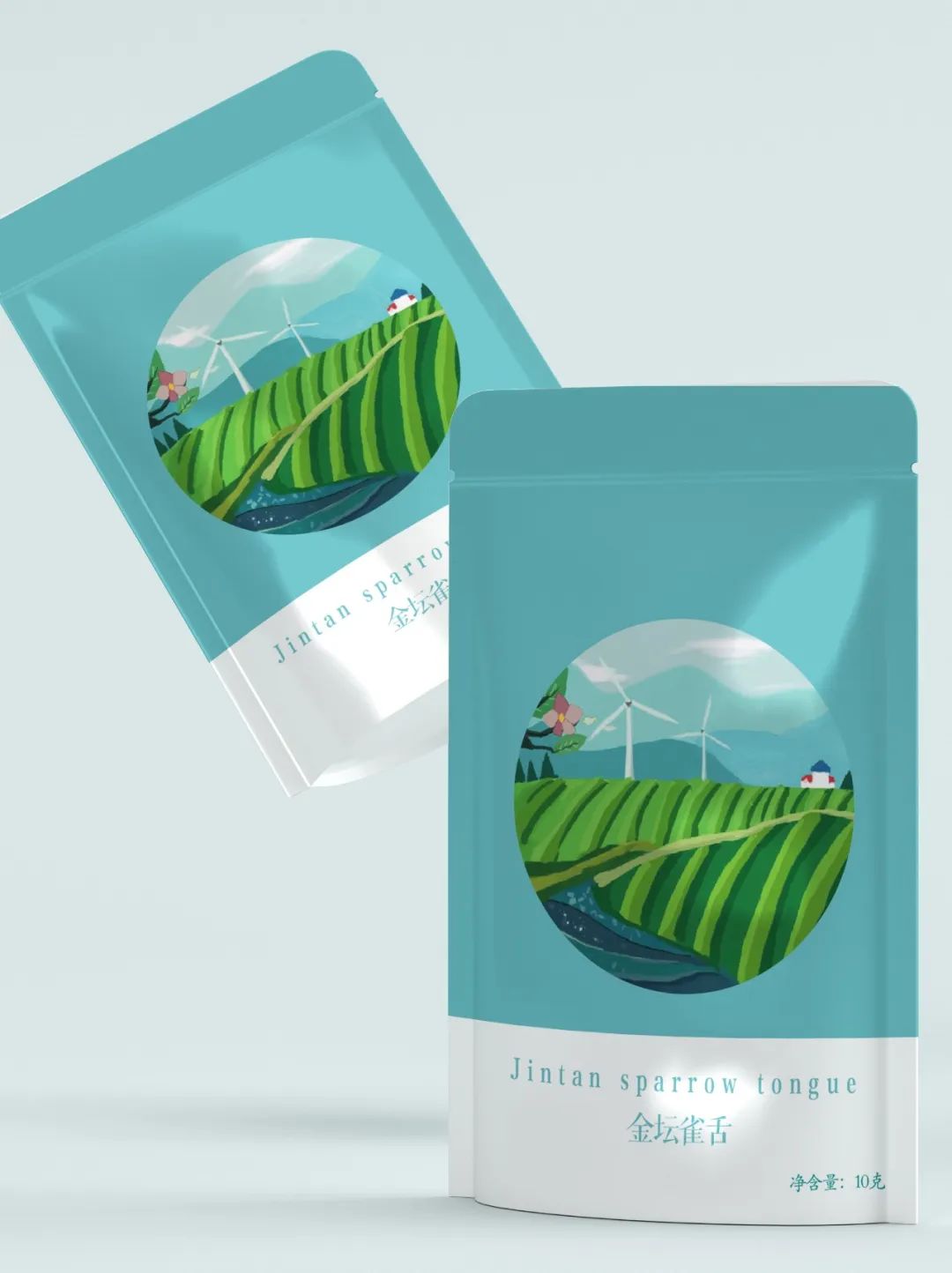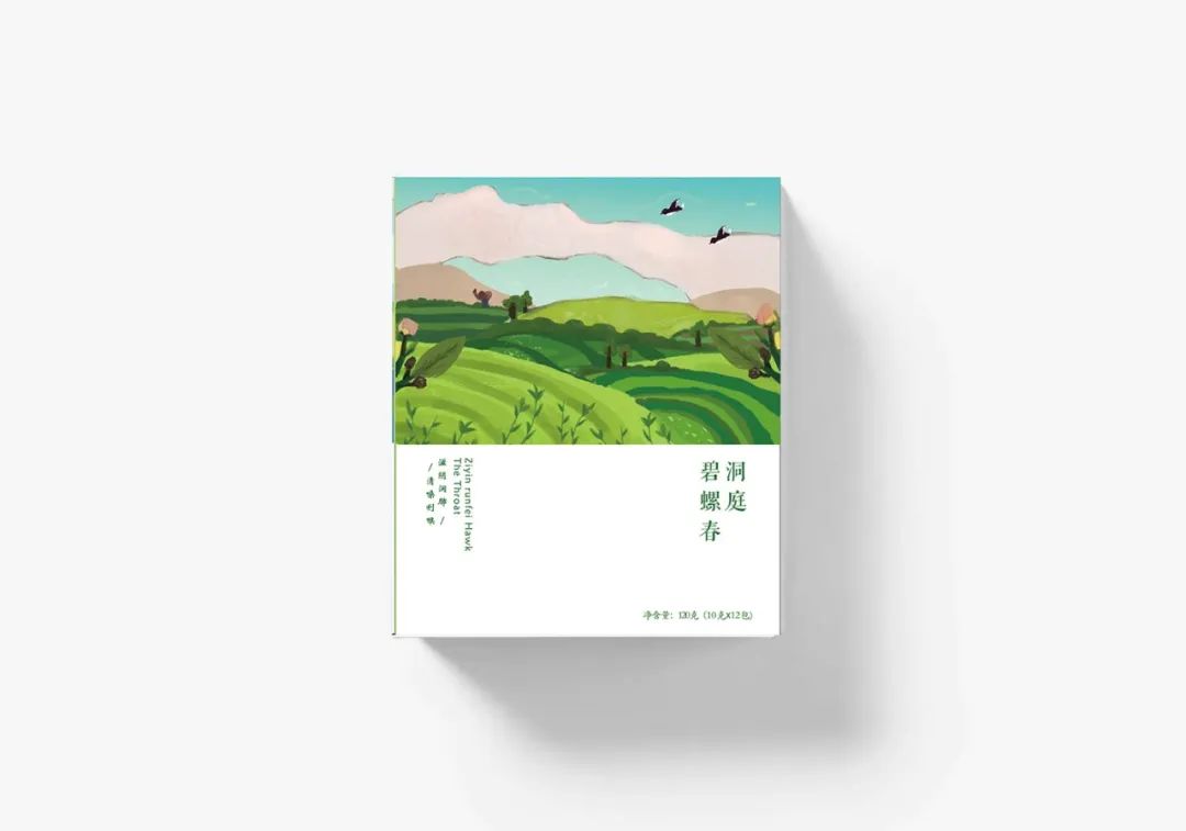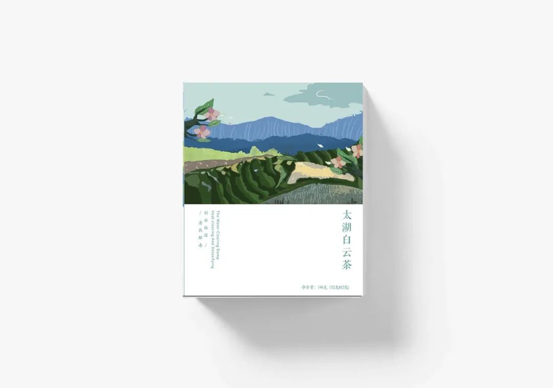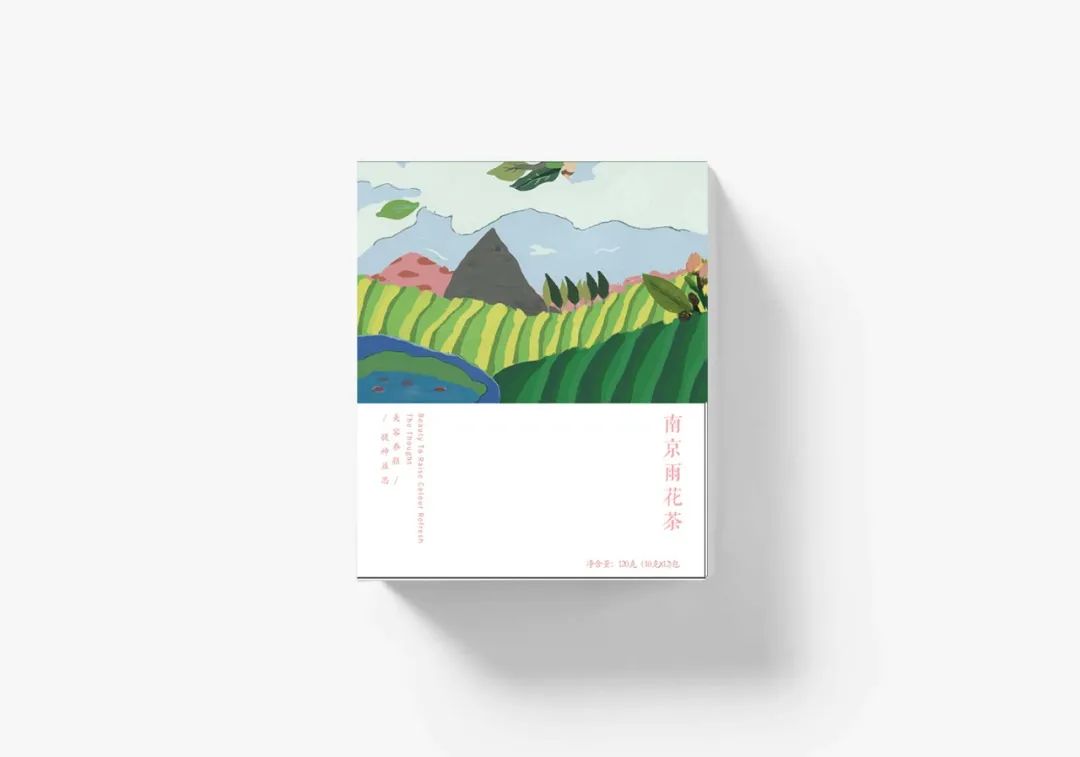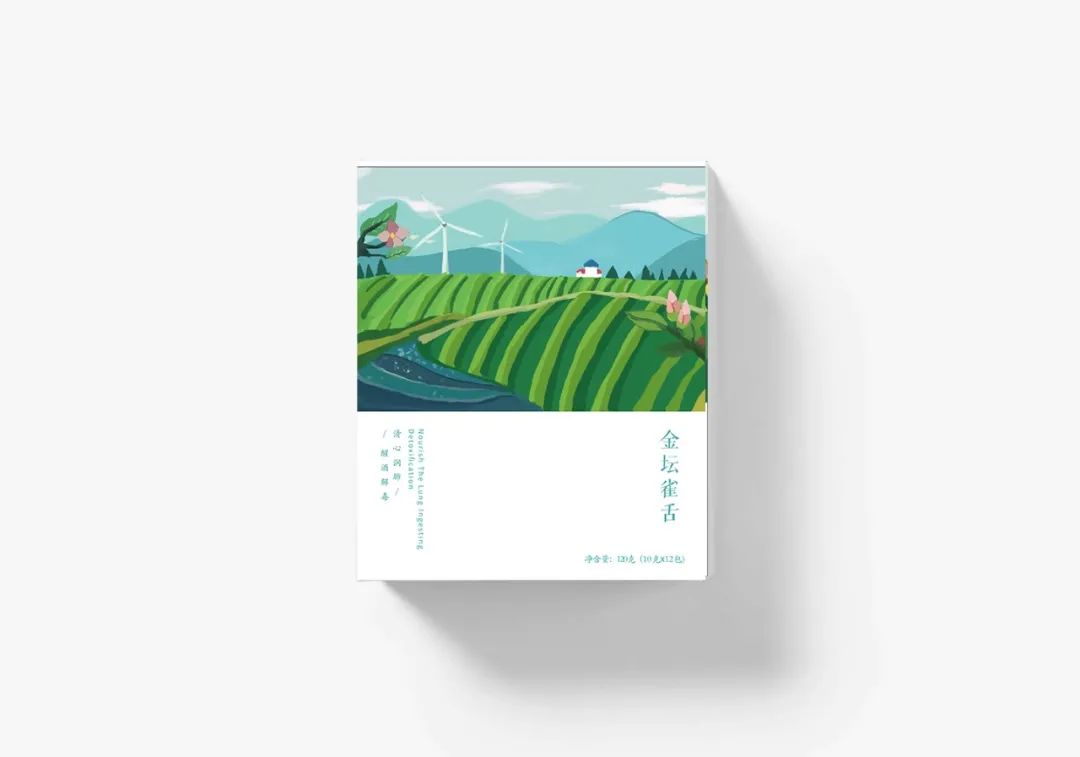我们设计了四款茶叶的包装,分别是:洞庭碧螺春、太湖白云茶、南京雨花茶和金坛雀舌。在它的外包装设计上,我们用色块厚涂的绘画手法表现了四幅不同的茶田风景,在线条设计上我们选择用不规整、不流畅的线条来表示肌理的感觉,配色上采用渐变的效果,有明暗面区分,画面立体生动有层次,意在展示一幅“一帘春欲暮,茶烟细杨落花风”的茶田风景图。