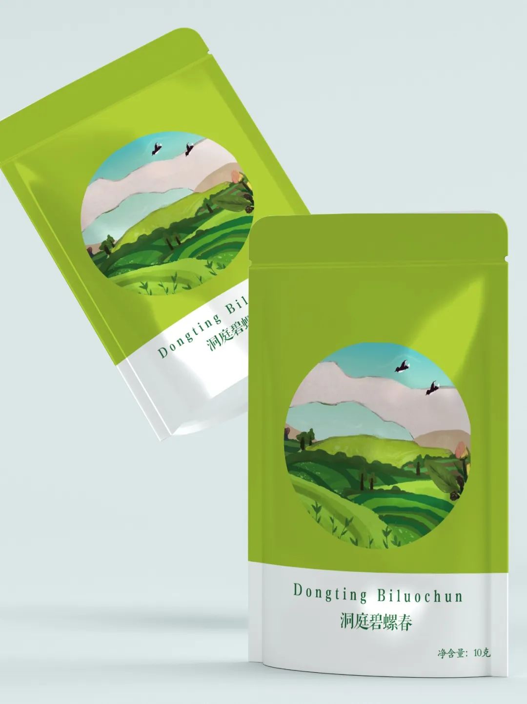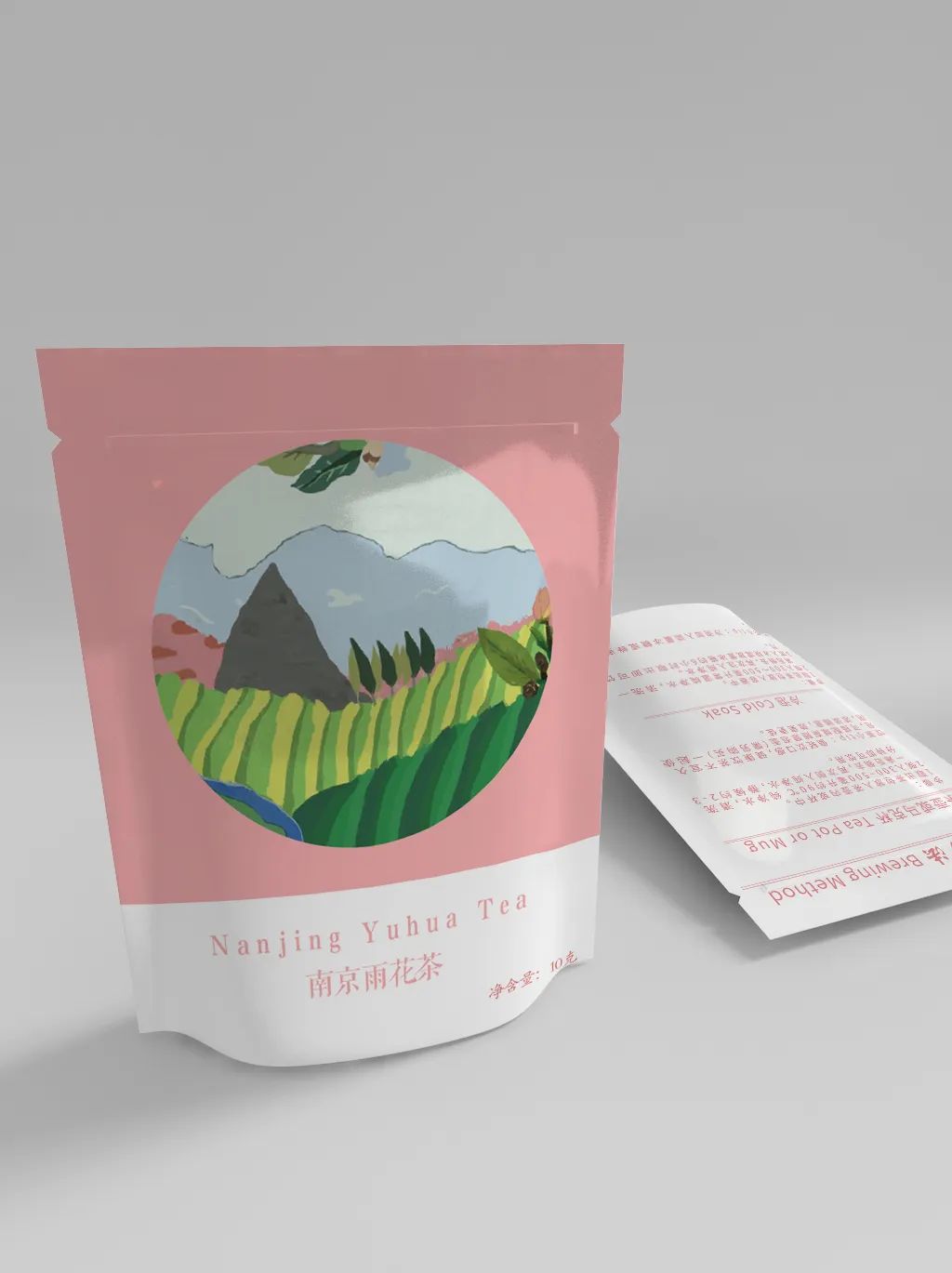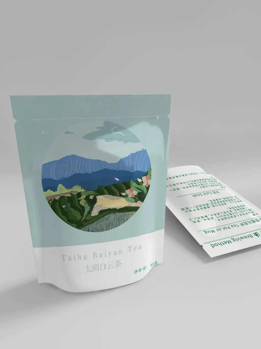 我们设计了四款茶叶的包装,分别是:洞庭碧螺春、太湖白云茶、南京雨花茶和金坛雀舌。在它的外包装设计上,我们用色块厚涂的绘画手法表现了四幅不同的茶田风景,在线条设计上我们选择用不规整、不流畅的线条来表示肌理的感觉,配色上采用渐变的效果,有明暗面区分,画面立体生动有层次,意在展示一幅“一帘春欲暮,茶烟细杨落花风”的茶田风景图。