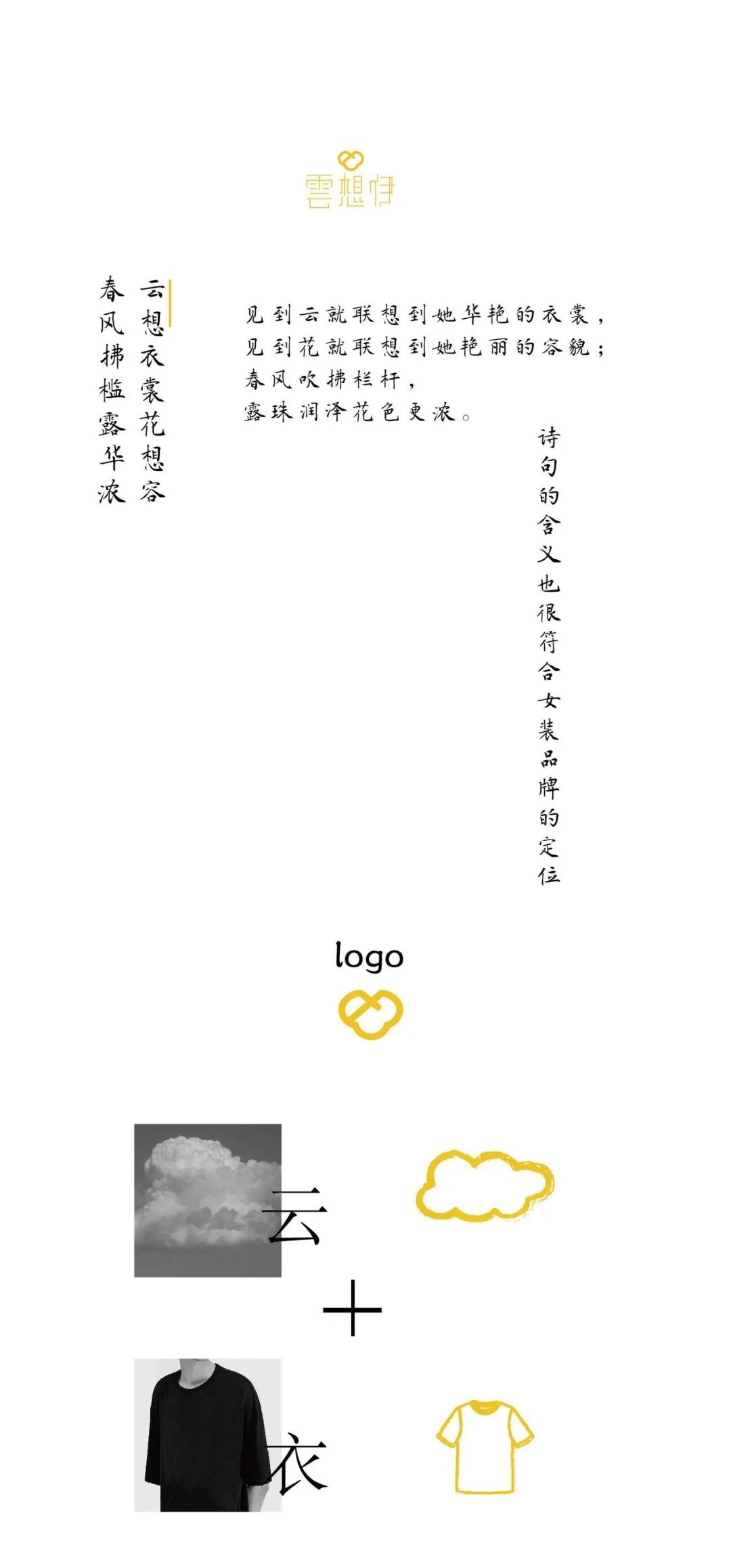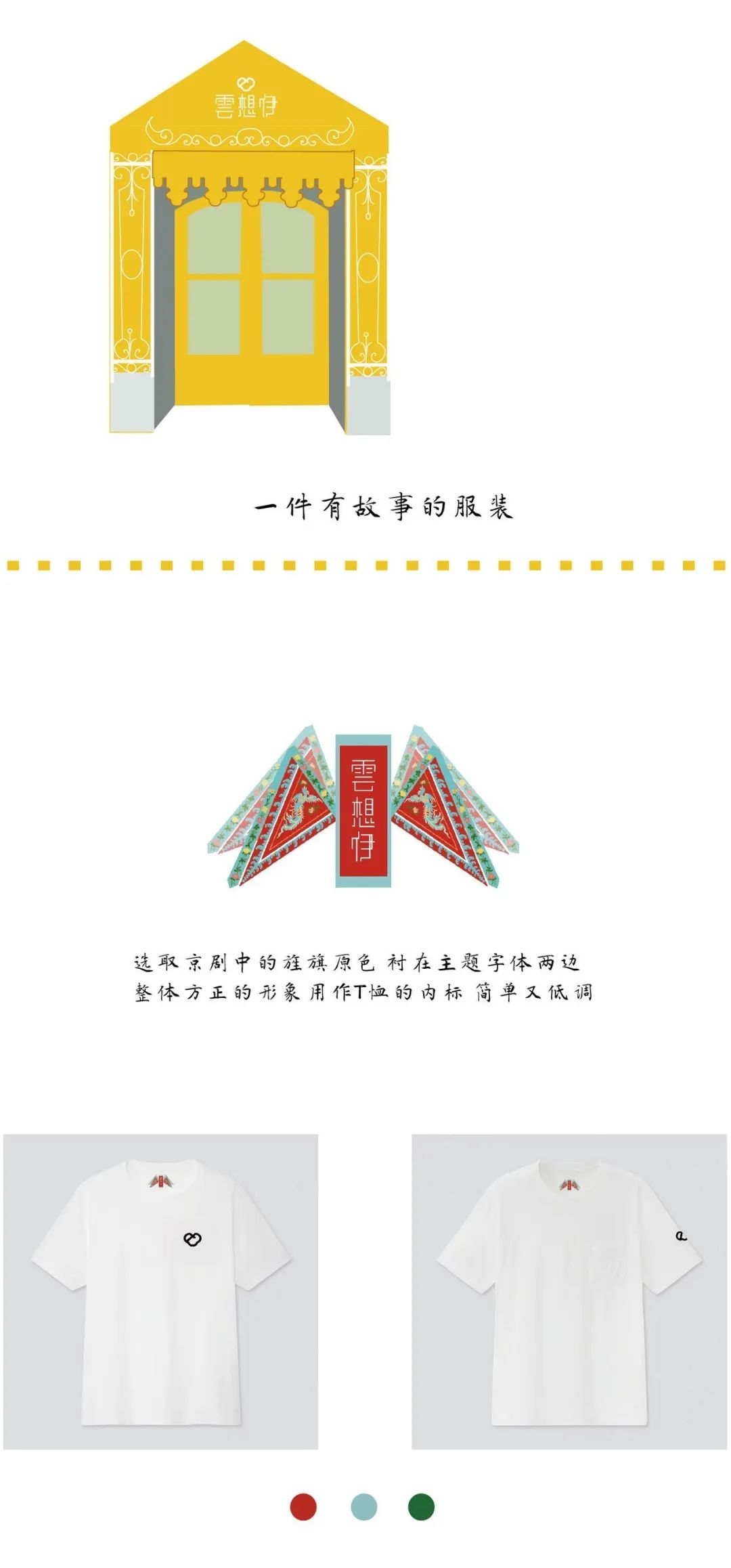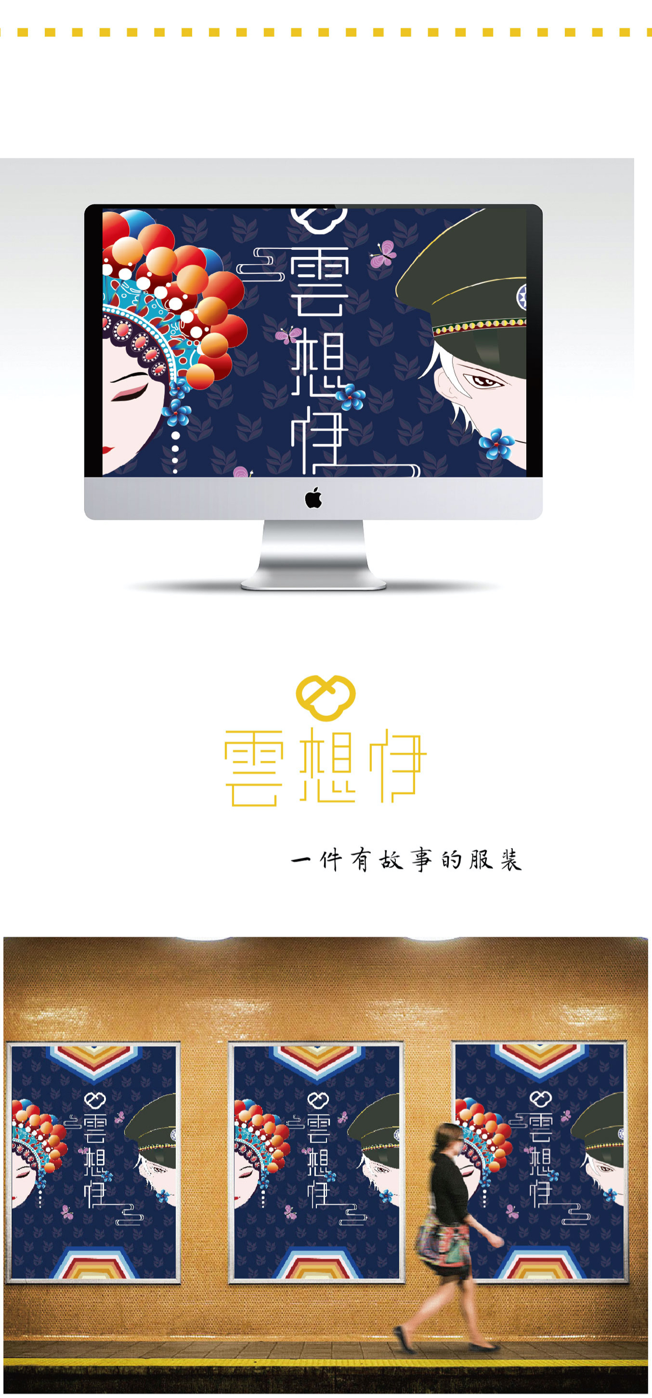 云想伊是一个女装品牌,名称取自李白《清平调》中的“云想衣裳花想容”这句诗词。美艳动人的容貌服饰,以至白云和牡丹也要为你来装扮。也符合本品牌对服装和女性的两个定位。整个品牌都是围绕民国时期的戏曲元素展开,并融合现代设计理念,创作了一个全新的服饰品牌。以民国时期的梨园女子对军阀暗生情愫为创作背景,绘制了插画、服装图案以及生旦净丑的人物立绘等。“一件有故事的服装”是店铺的宣传语。五个故事场景分别为初见、相恋、分开、离别和再见。绘制一出梨园好戏,以吸引读者并产生猜想。这个故事是否与云想伊的名称有联系。拥有情感支撑的插画绘制也是与其他服装品牌的不同之处。军阀和花旦的爱情故事做情侣款的服装也是很好的选择。