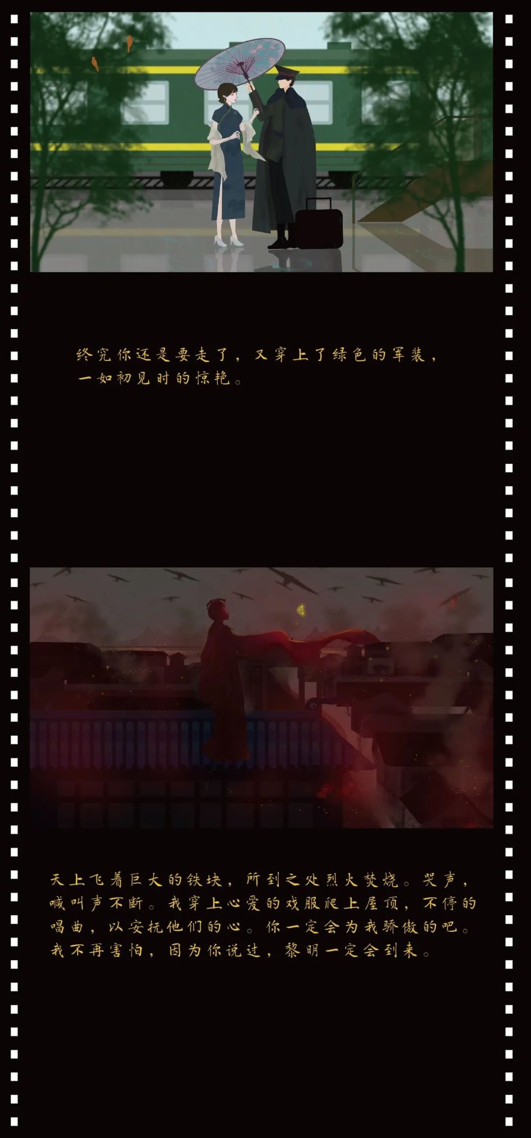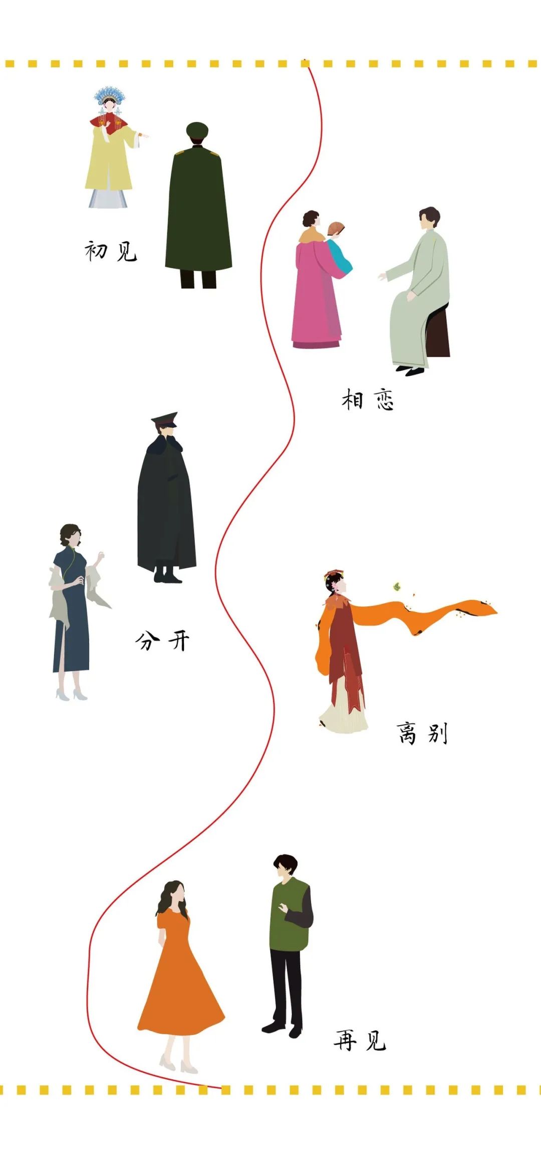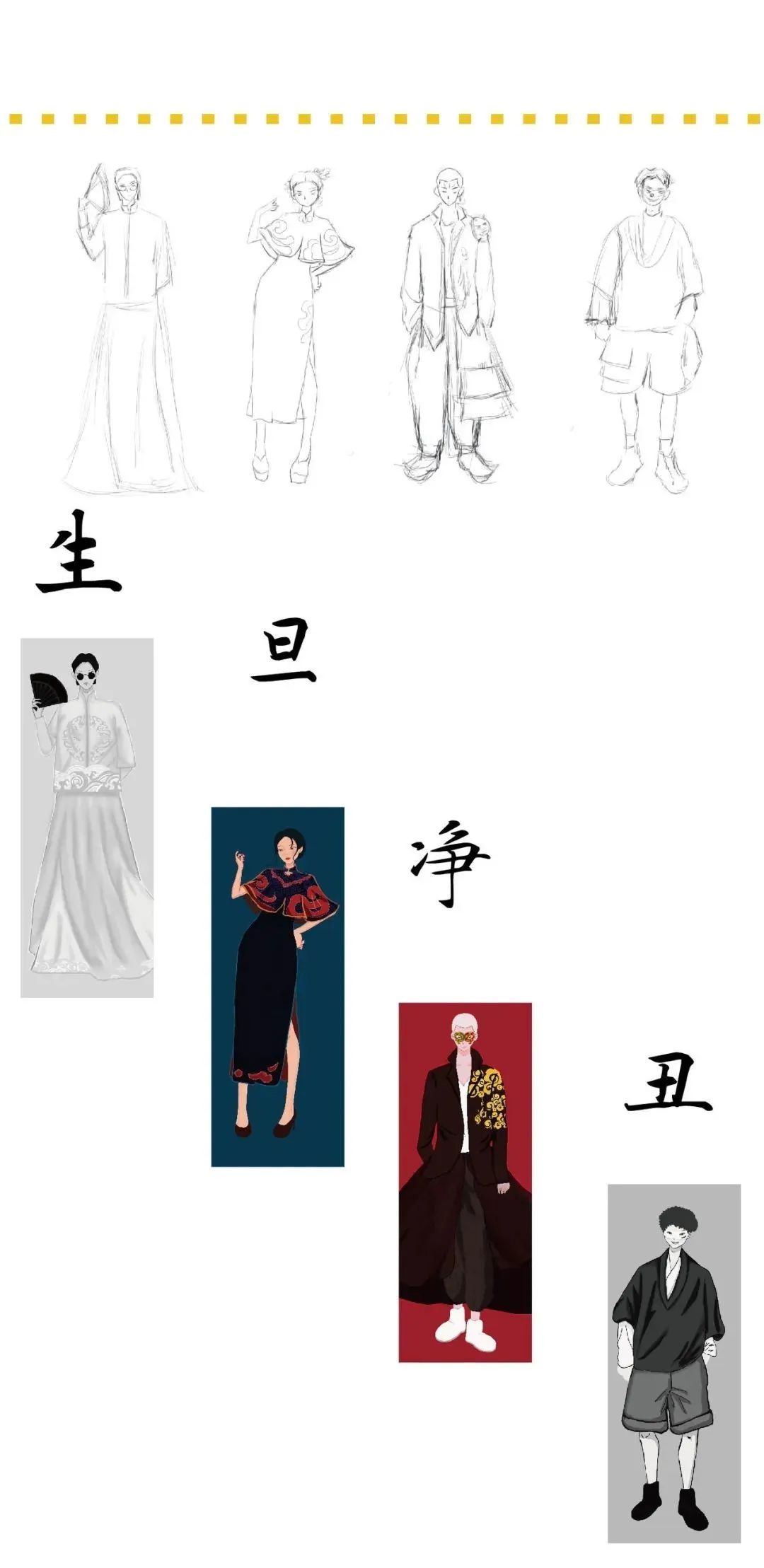 云想伊是一个女装品牌,名称取自李白《清平调》中的“云想衣裳花想容”这句诗词。美艳动人的容貌服饰,以至白云和牡丹也要为你来装扮。也符合本品牌对服装和女性的两个定位。整个品牌都是围绕民国时期的戏曲元素展开,并融合现代设计理念,创作了一个全新的服饰品牌。以民国时期的梨园女子对军阀暗生情愫为创作背景,绘制了插画、服装图案以及生旦净丑的人物立绘等。“一件有故事的服装”是店铺的宣传语。五个故事场景分别为初见、相恋、分开、离别和再见。绘制一出梨园好戏,以吸引读者并产生猜想。这个故事是否与云想伊的名称有联系。拥有情感支撑的插画绘制也是与其他服装品牌的不同之处。军阀和花旦的爱情故事做情侣款的服装也是很好的选择。