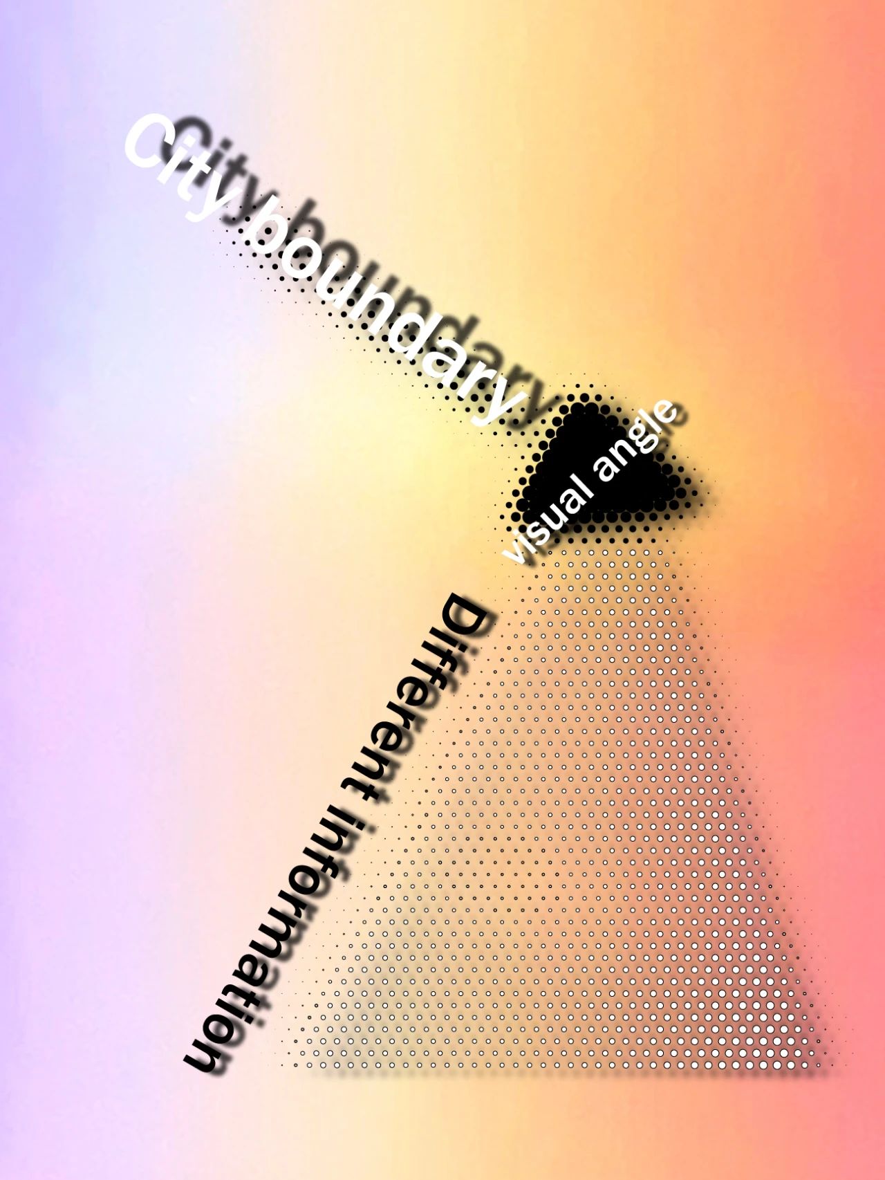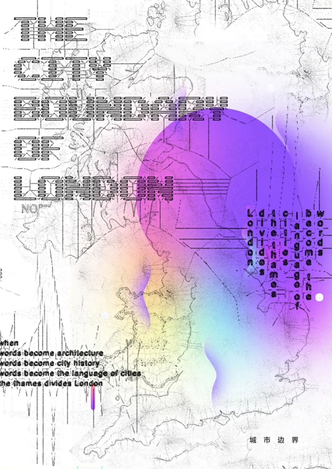 运用光学中棱镜折射为创意点,结合论文中独特的图像学视角切入点,以城市为研究对象,透过图像学视角为棱镜,折射出城市边界与城市意象之间不可分离却又多样化的关系形式,透过独特视角观察探讨出更多不同的城市表达方式。最终运用强烈的色彩以及卫星地图形式的图像表达、加以字体的设计编排来呈现本次作品。