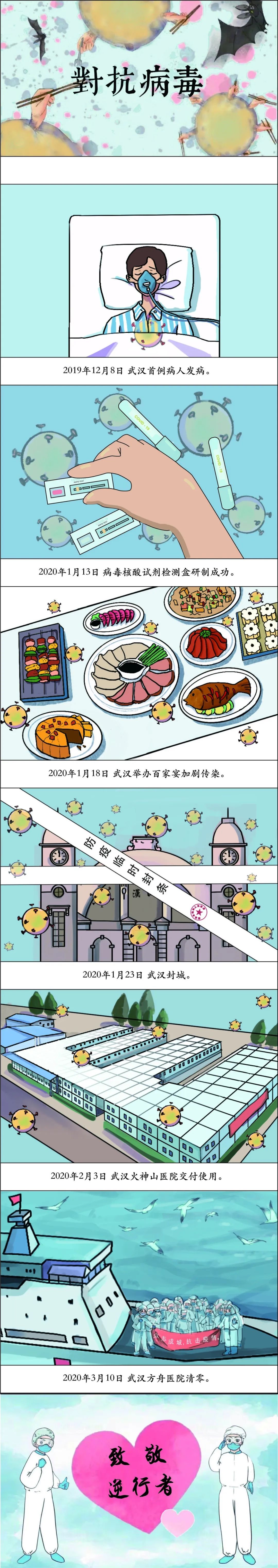 作品介绍:今年的毕业设计选用了抗击新冠病毒这个时事热点作为主题创作。我收集疫情期间重大时间节点,挑选了6个代表性的节点,讲了由开始到爆发到控制的过程。除了时间线我还以病毒的多少来反映事情的进程,最先患病的病人用了一个病毒来表示开始,然后确认人传人发明来试剂来检测病毒,举行百家宴为武汉彻底爆发埋下隐患,后来彻底爆发政府及时采取有效手段,封城,建立医院保证了患者及时治疗,病情得到控制,病毒减少,到最后方舟患者清零所以画面没有病毒。整体选用蓝色冷色调,主要是想强调及时有效的手法能够给人带来安心的感觉,事情很严峻,但是国家很可靠。