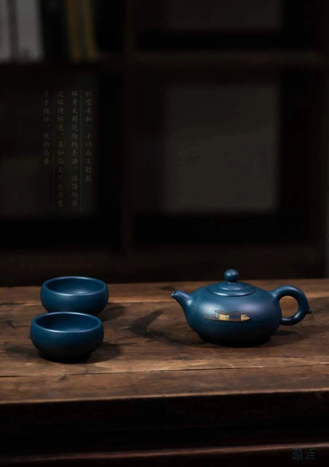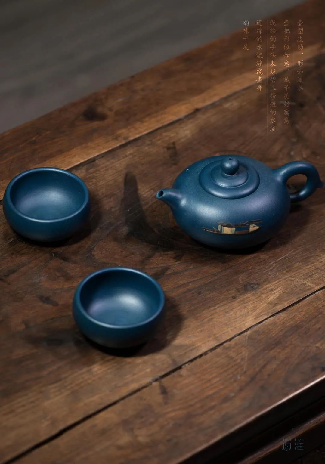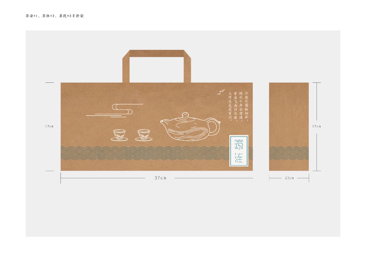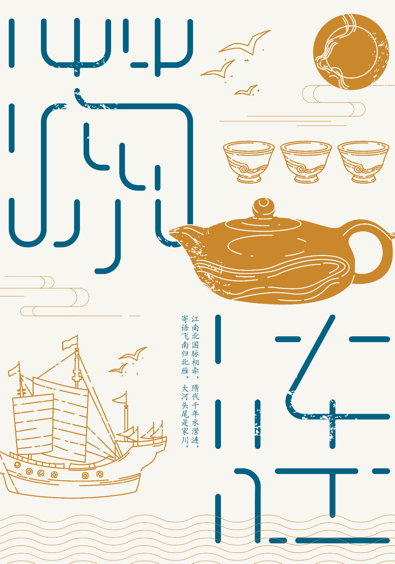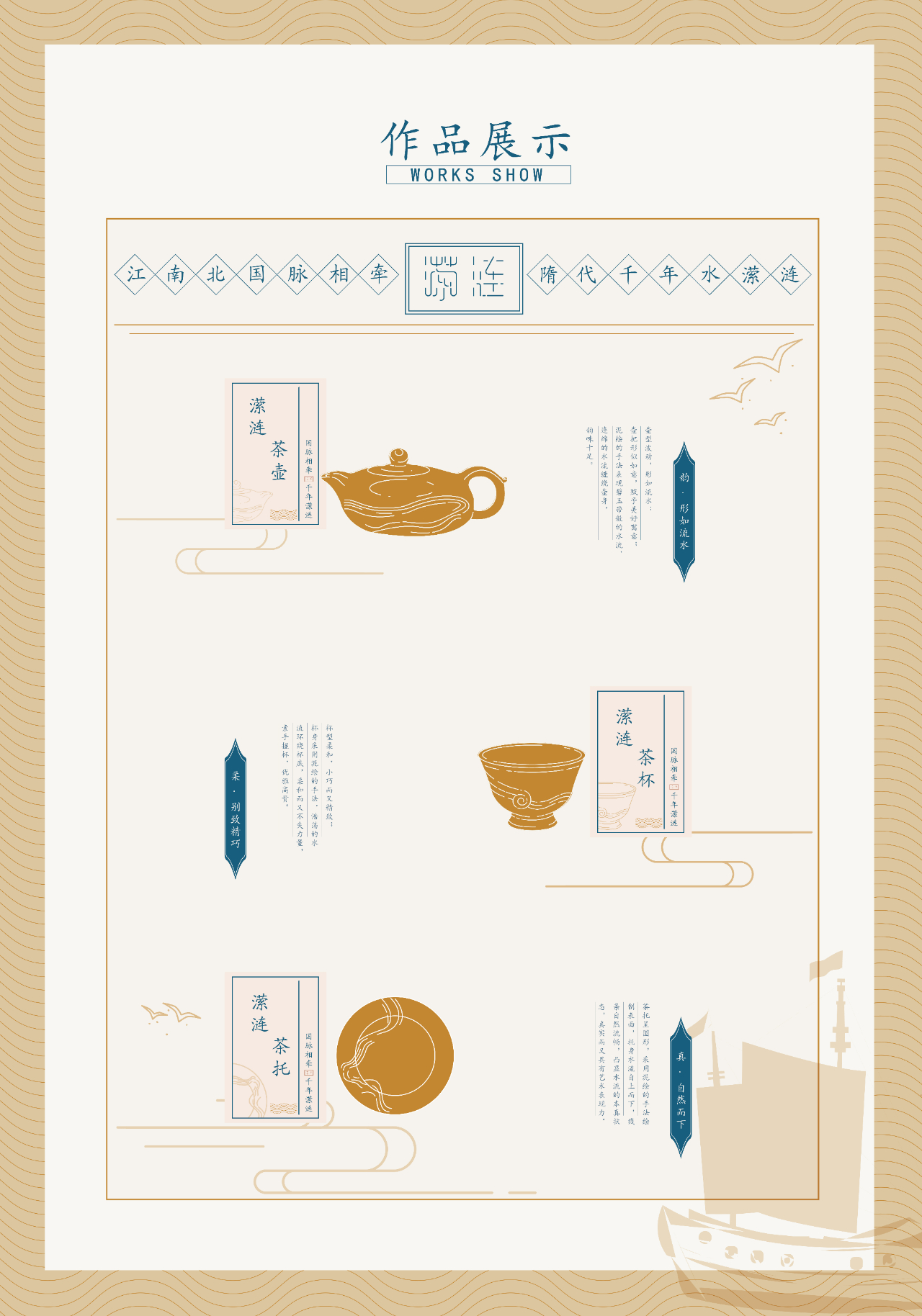 茶壶壶型具有波动感,壶把形似如意,赋予美好的寓意;壶嘴微微向下,与壶本身形成一种自然地曲线;壶身采用泥绘的表现手法,水流飘飘荡荡,如碧玉带一般,环绕在壶身,船只在连绵起伏河流上前行,天空中飞鸟自由翱翔,整个画面描写出一幅浩浩荡荡的运河景象 。茶壶典雅而又不失力量,连绵的水流表现出运河文化的源远流长,船只的在浩荡的水流之上破浪前行,力量无限,前促进着大运河流域各城市之间的发展与进步 。茶杯杯型小巧而精致,杯身底部由泥绘制成的水纹环绕整个杯子,线条柔和,展现大运河对周边城市的灌溉发展。