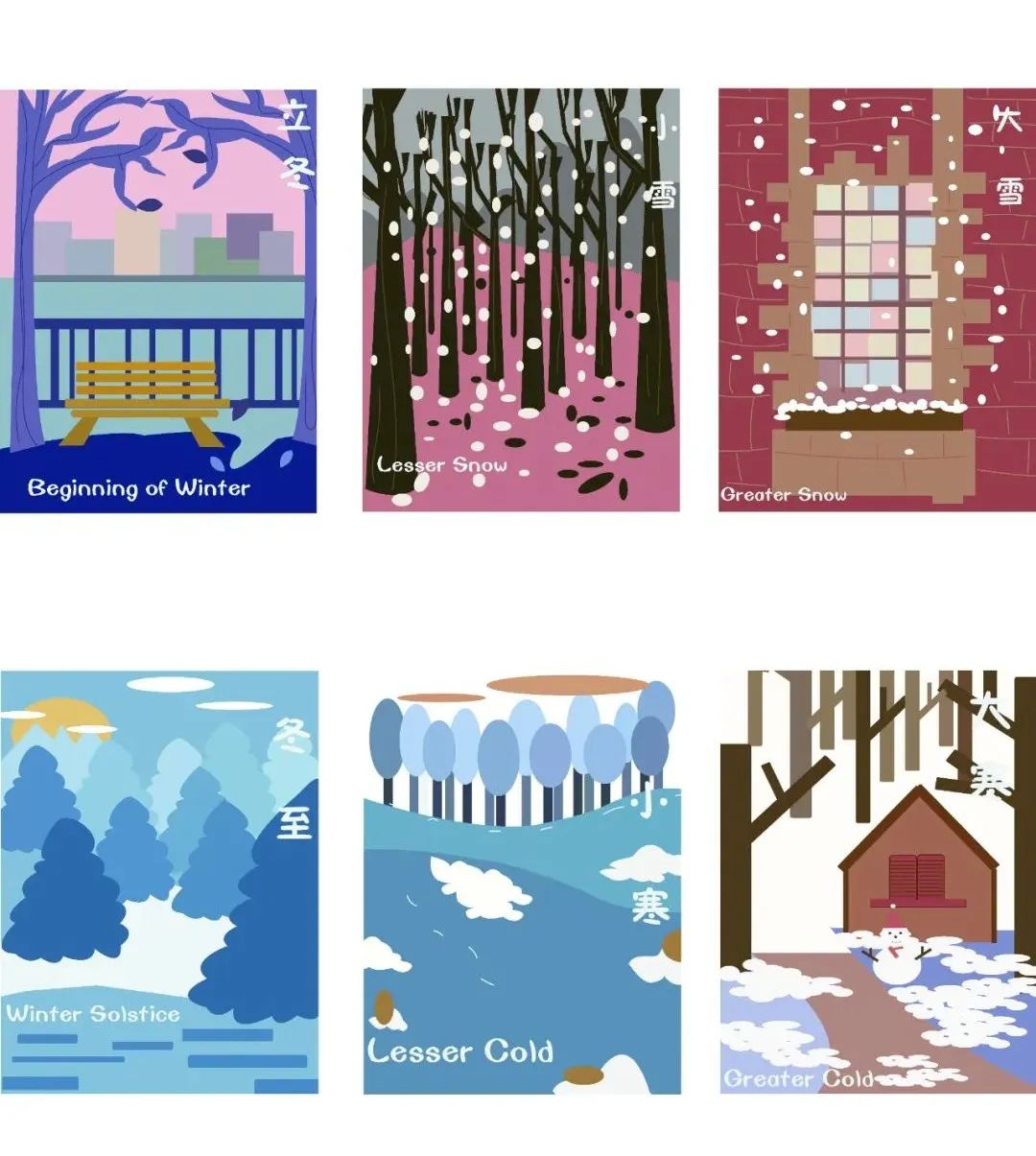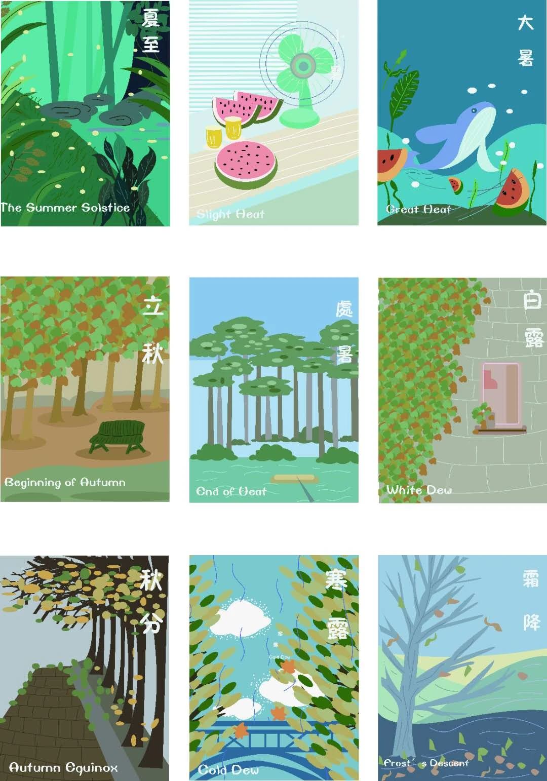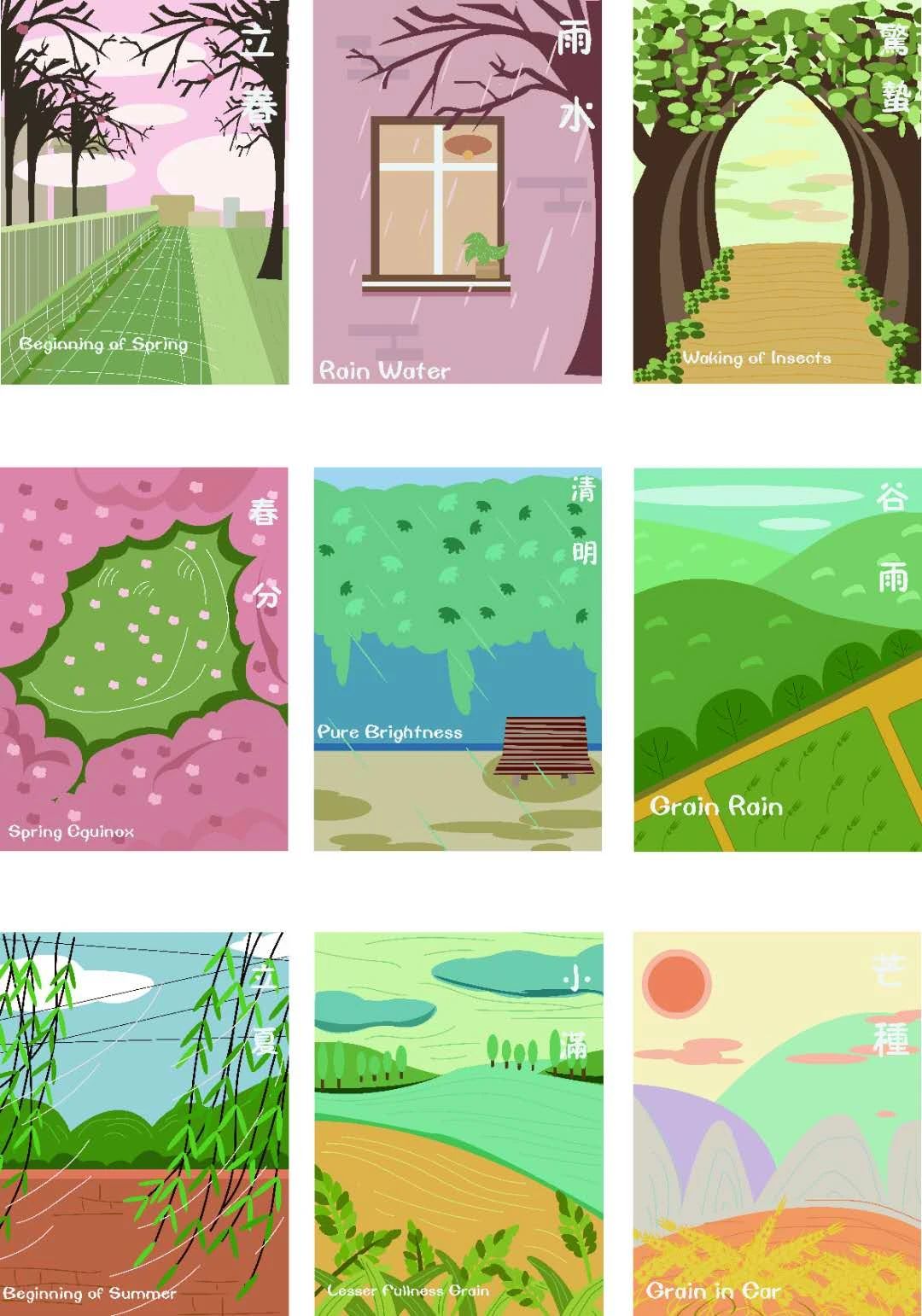 二十四节气是在看一档综艺节目的时候有的灵感。节目里的人说了这样一句话“这些节气的名称光听着就让人很舒服,很美好”当时就是被这句话打动了,竟然真的开始跟着读这些节气的名称,真的觉得每一个节气的名称都非常的具有灵性。诧异古人的智慧,竟能把一段时间总结的那么准确又那么美好。提炼每个节气的代表物与插画结合进行再设计,希望能够展现每个节气的美好。