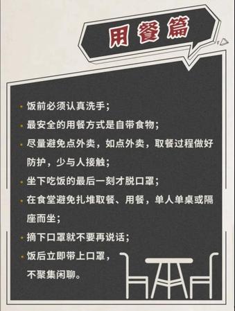 疫情期间,吃饭属于危险性较高的行动。一是进餐时不能戴口罩,二是吃饭时人容易扎堆儿,容易造成聚集性感染。错开吃饭高峰期,提早或者推迟吃饭时间。就餐时要拿出高考的秩序,保持间距,独自就餐,少说快吃。点外卖,选择无接触取餐,做好餐盒餐具的清洗、消毒。