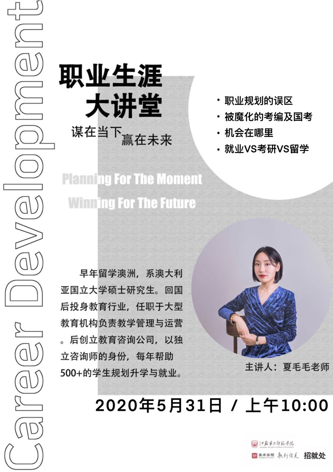 2020年5月31日上午10:00,举办职业生涯大讲堂系列讲座,欢迎同学线上收听。