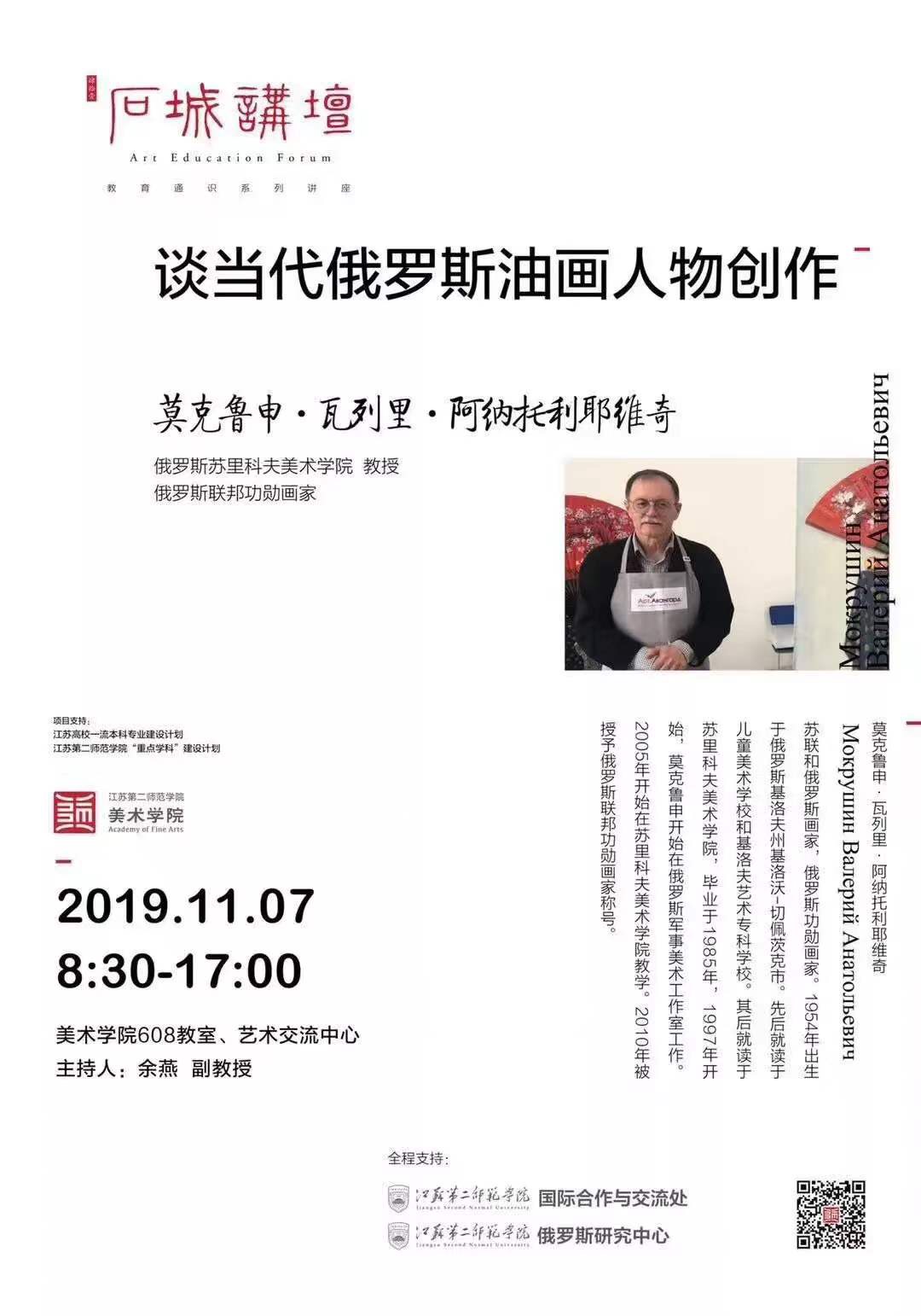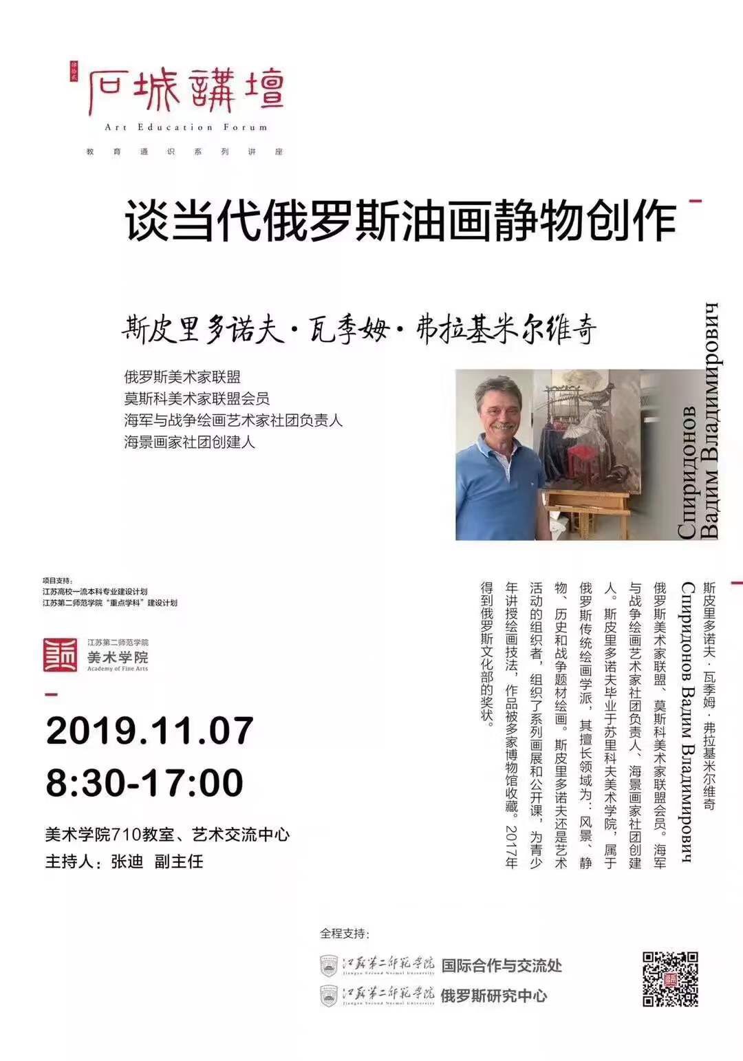 2019年11月7日,在校国交处、俄罗斯研究中心的大力推动下,美术学院特邀俄罗斯艺术家莫克鲁申·瓦列里·阿纳托利耶维奇与斯皮里多诺夫·瓦季姆·弗拉基米尔维奇来校,将于艺术体育综合楼608、710教室、艺术交流中心举办以《当代俄罗斯油画人物与景物创作》为题的学术讲座与实践交流活动。