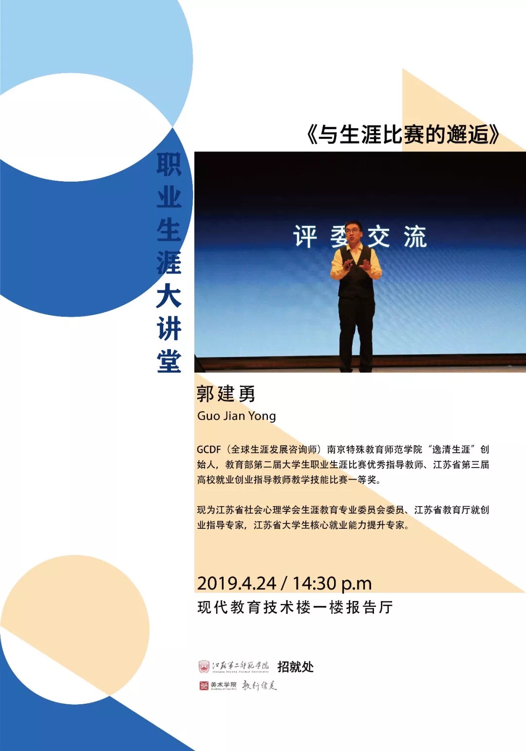 2019年4月24日下午2:30,举办职业生涯大讲堂系列讲座,请同学们于2点20分之前入场。