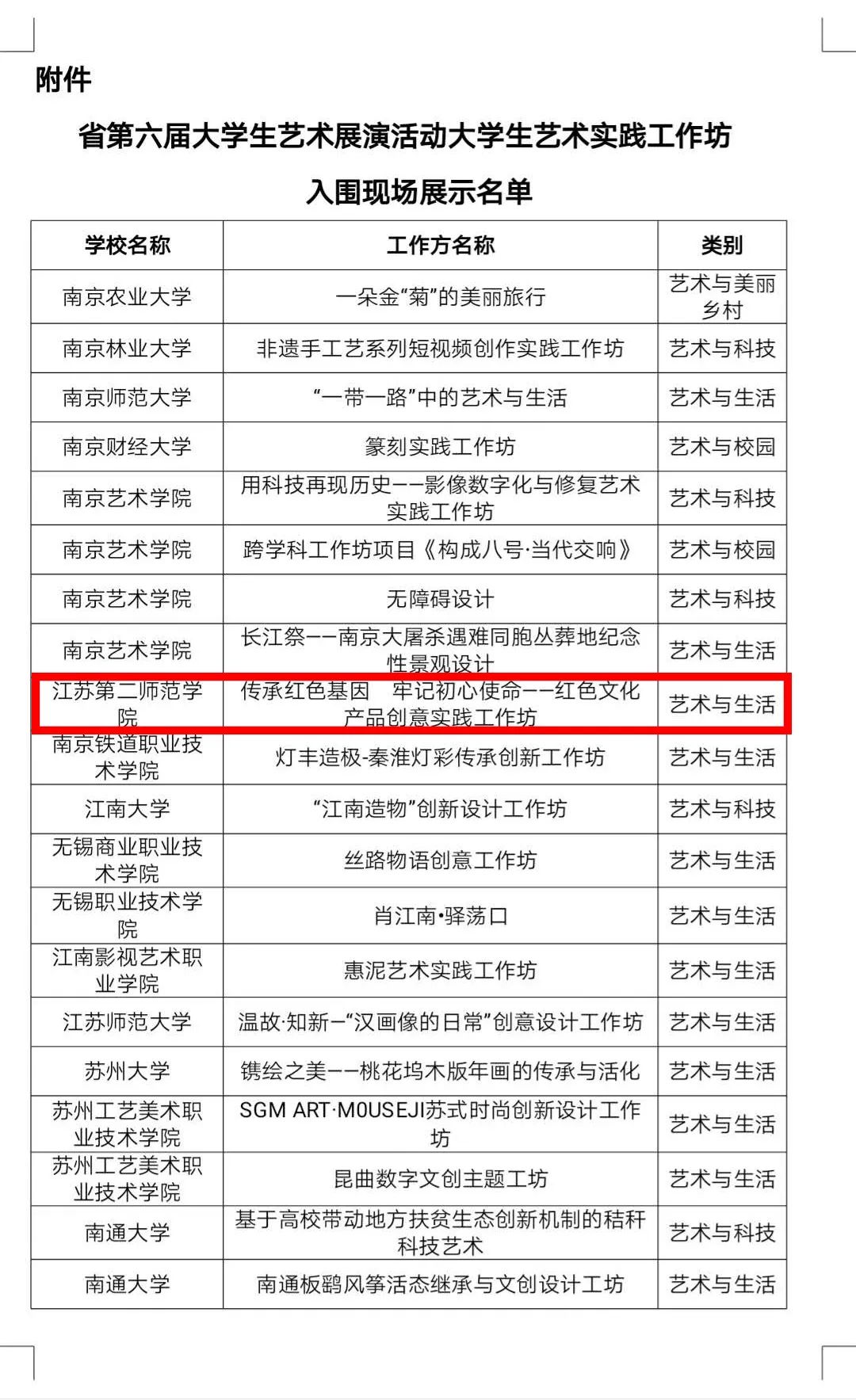 根据《省教育厅关于举办江苏省第六届大学生艺术展演活动的通知》精神,本届共收到全省高校参评工作坊104个。经过评委组遴选,22个工作坊入围现场展示,江苏第二师范学院美术学院“传承红色基因 牢记初心使命——红色文化产品创意实践工作坊”名列其中。