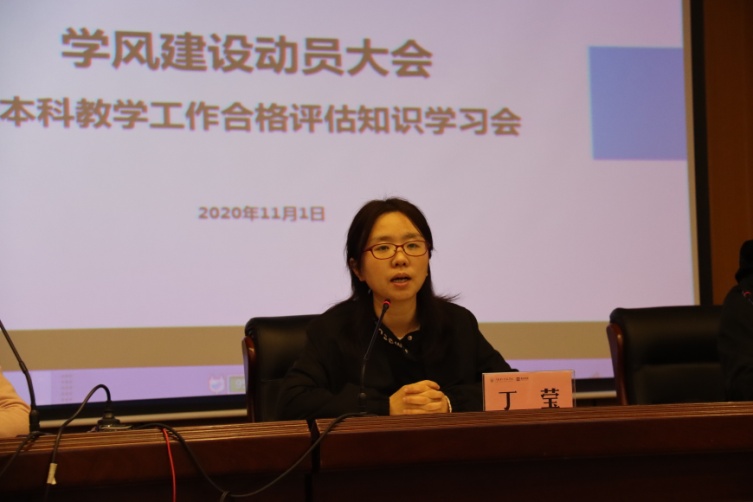 首先,丁莹做动员讲话。她指出学风是一所学校校风的重要体现和核心要素,它是学生在校学习生活过程中,所表现出来的精神面貌,是学生在校园中,经过长期教育和影响逐渐形成的行为风尚。建设优良学风是建设优良校风的中心任务和根本保证。她强调,全体党员、发展对象、积极分子和学生干部要在学风建设中加强责任担当,强化落实力度,端正学习态度,以良好的精神风貌为学院的学风建设做出贡献,助力本科教学工作合格评估顺利通过。