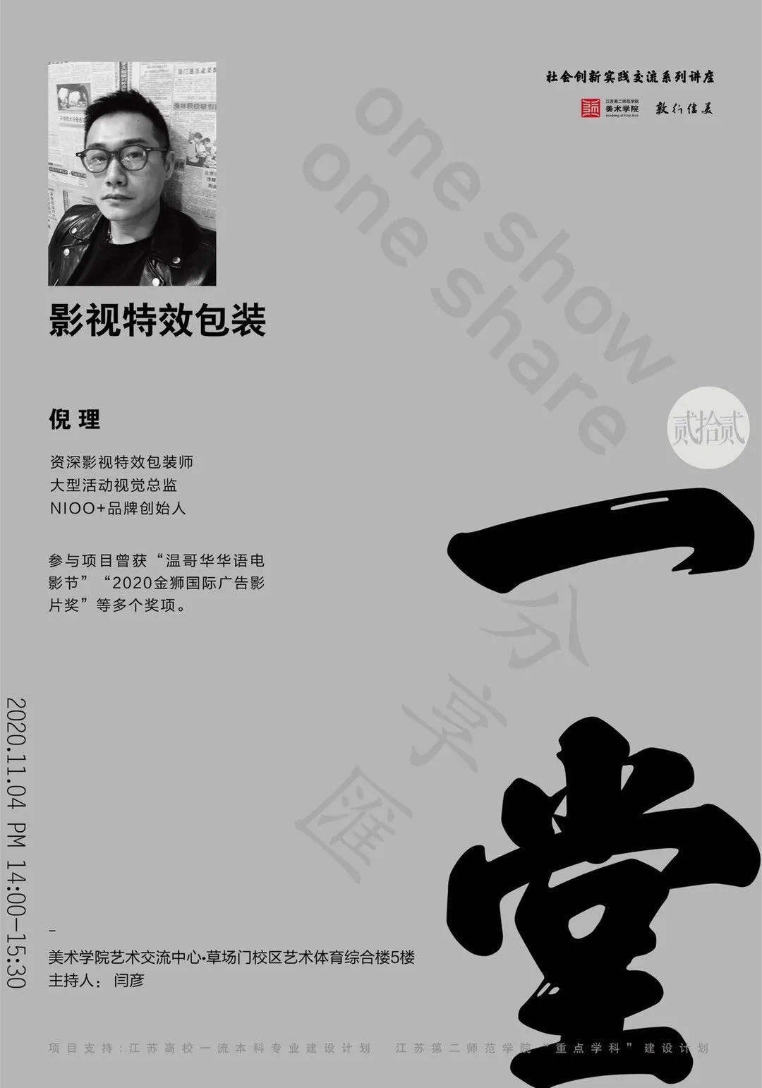2020年11月4日下午两点,江苏第二师范学院美术学院特邀资深影视特效包装师、大型活动视觉总监、NIOO+品牌创始人倪理先生来校,在草场门校区艺术交流中心开展题为《影视特效包装》讲座。美术学院2018级、2019级和2020级视觉传达专业与环境设计专业的同学参加本次讲座,讲座由美术学院视觉传达设计系主任闫彦老师主持。