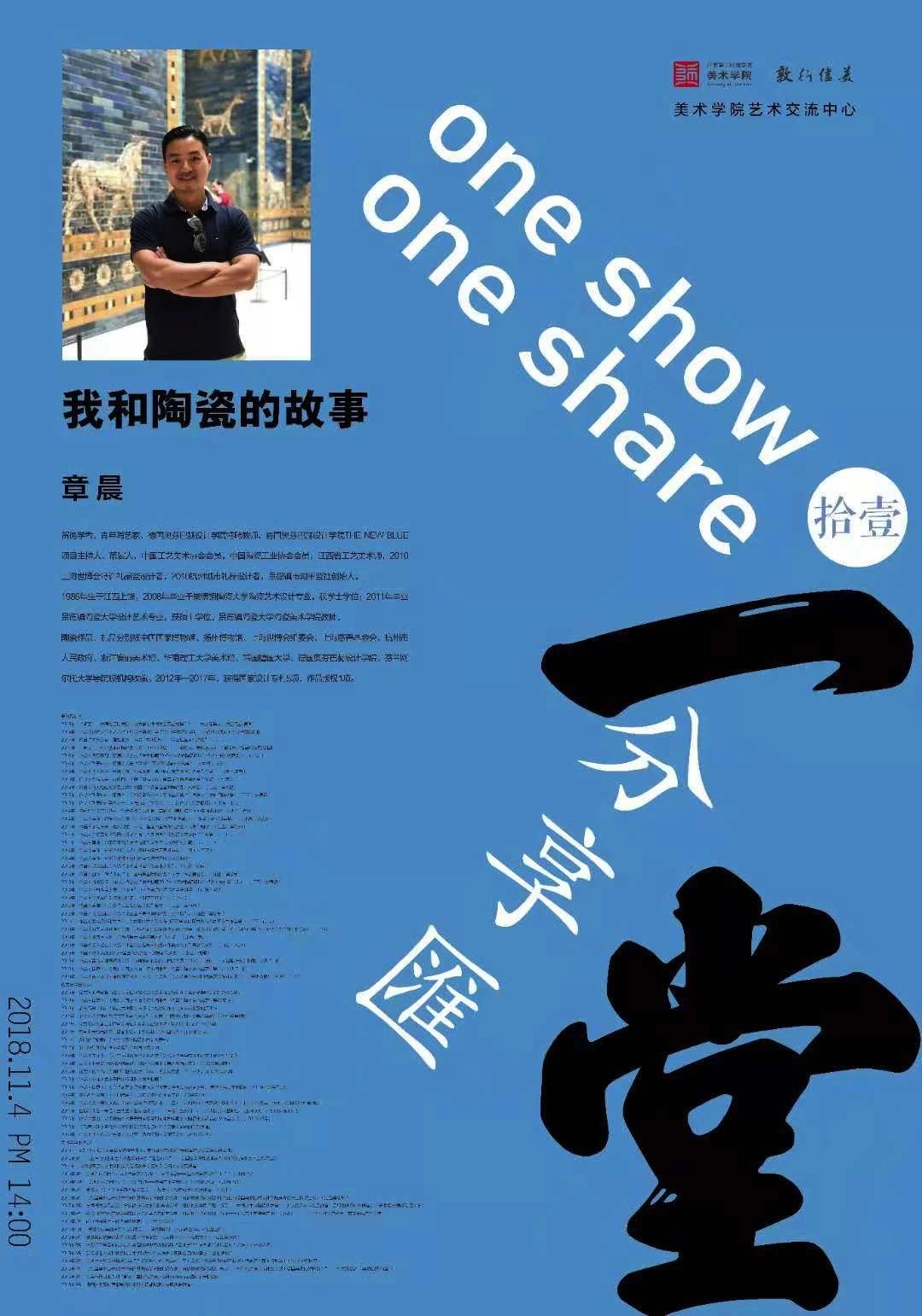 2018年11月4日下午两点,美术学院特邀景德镇市湖田瓷社创始人、德国奥芬巴赫设计学院特聘教师章晨来校分享主题为《我和陶瓷的故事》学术讲座。本次一堂分享会由美术学院副院长路明主持,美术学院美术学定向专业全体学生到场参加并认真聆听。