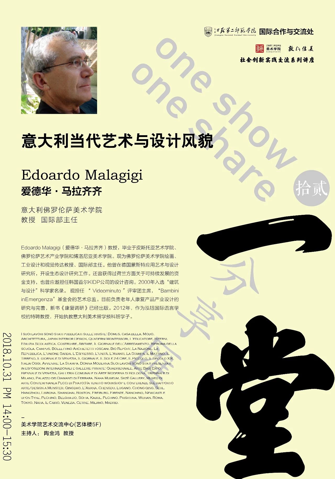 2018年10月31日下午两点,美术学院特邀意大利弗洛伦萨艺术学院爱德华·马拉齐齐教授来校分享主题为《意大利当代艺术与设计风貌》的学术讲座。本次一堂分享会由美术学院副院长陶金鸿主持,美术学院视觉传达设计专业与环境设计专业全体学生到场参加并认真聆听。