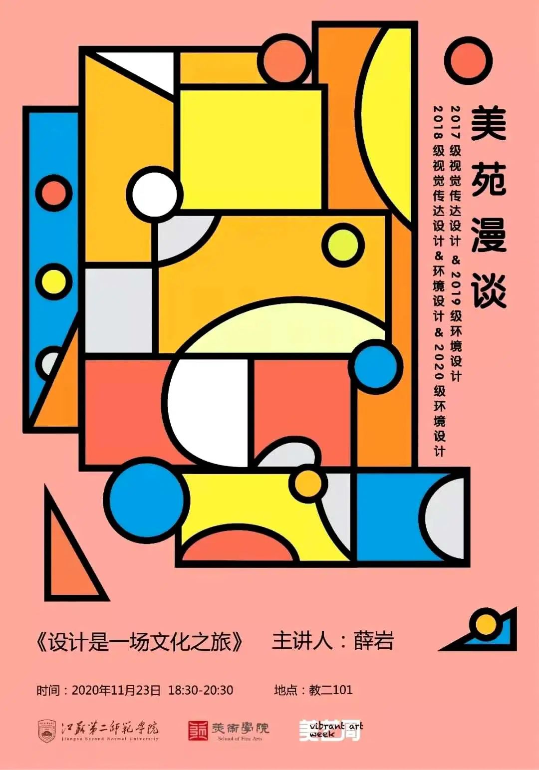 11月23日晚6:30,美术学院举办美苑漫谈系列讲座《设计是一场文化之旅》,美术学院环境设计专业教师薛岩老师主讲。美术学院视觉传达设计专业和环境设计专业全体同学参加了讲座。