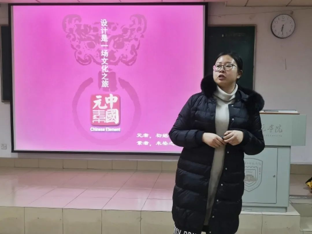 讲座中,薛岩老师从四个方面讲述了中国设计的文化历程。首先从“什么是文化元素”,讲解了中国元素在设计中的应用;接着从“有形的文化元素”,展示了汉字、图形图像、色彩在设计中的表现与展示;然后从“无形的文化元素”,讲述了中华文化运用到现代设计中,强调了思想的重要性;最后从“如何增加设计中的文化深度”,告诉同学们设计需要继承与创新,应养成设计文化的思维:要有好奇和尊重的心、听故事和讲故事、艺术是相通的,以及设计文化的诀窍:品牌形象化、赋予内涵、传统民俗。