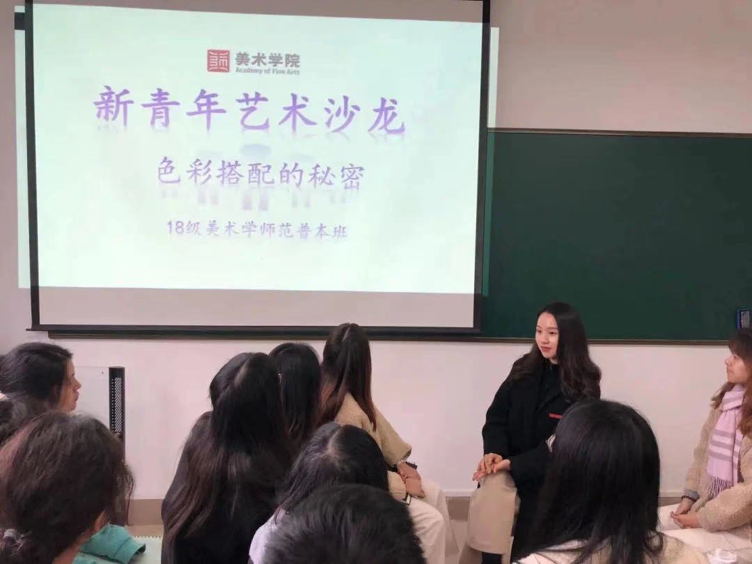 11月24日下午,为了加强学生美术专业理论的理解,提高学生色彩表达能力,美术学院新青年艺术沙龙——色彩搭配的秘密在北楼405举办。18级美术学普本班班主任卢雨梦和18级美术学普本班全体学生参加了此次活动。活动由卢雨梦主持。