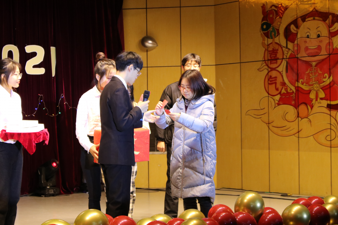 相声表演结束后,章砚文老师为学生会同学颁布优秀干部奖。同时,我们揭晓了激动人心的一等奖幸运儿----“19视传桑慧同学”。同时,她也是今天的寿星,在场的同学们一同为她唱生日歌。