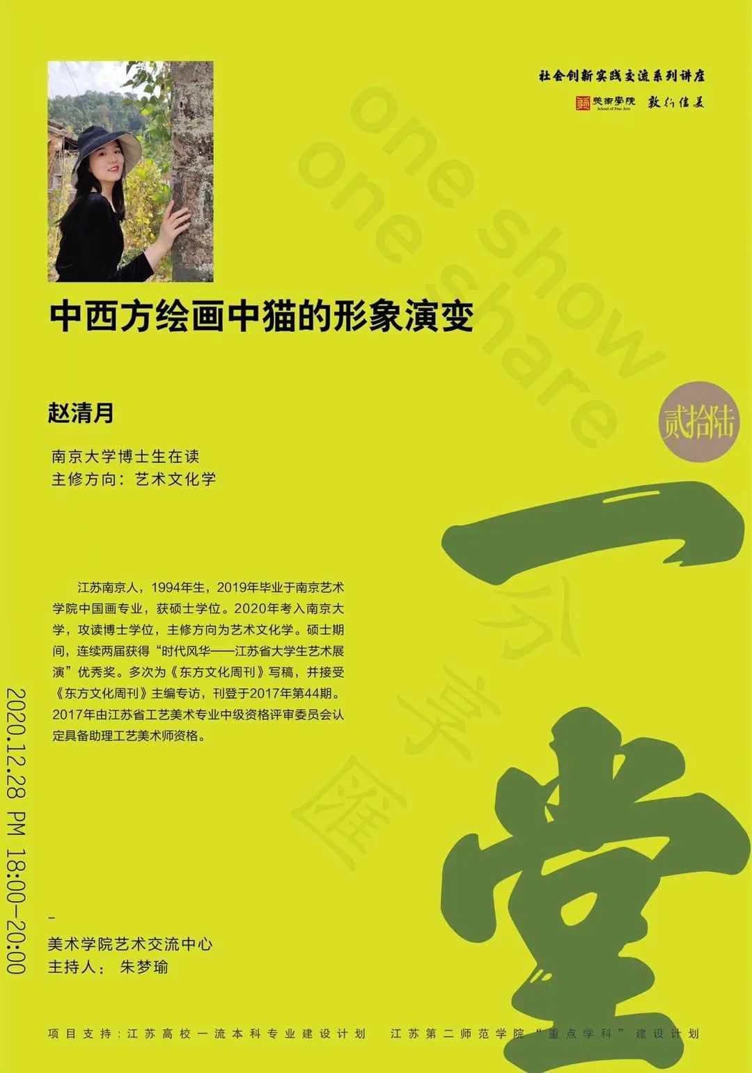 12月28日下午六点,江苏第二师范学院美术学院在草场门校区艺术体育综合楼艺术交流中心开展题为《中西方绘画中猫的形象演变》的一堂分享汇系列讲座,本场讲座由南京大学在读博士生赵清月主讲。美术学院20级定向和20级转本班全体同学参加此次讲座,讲座由朱梦瑜老师主持。
