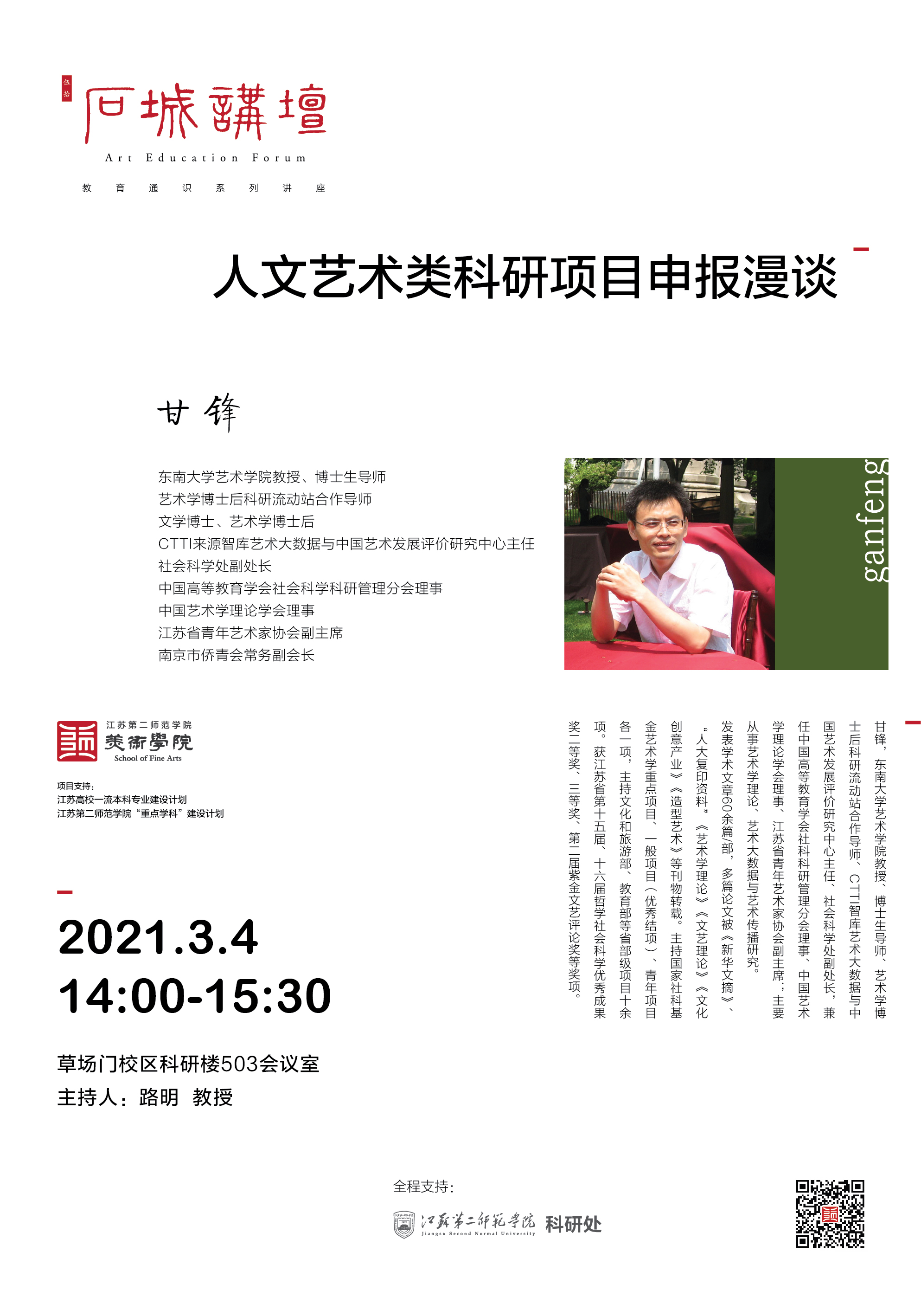 甘锋,东南大学艺术学院教授、博士生导师,艺术学博士后科研流动站合作导师,文学博士、艺术学博士后,CTTI来源智库艺术大数据与中国艺术发展评价研究中心主任社会科:学处副处长,中国高等教育学会社会科学科研管理分会理事,中国艺术学理论学会理事,江苏省青年艺术家协会副主席,南京市侨青会常务副会长。