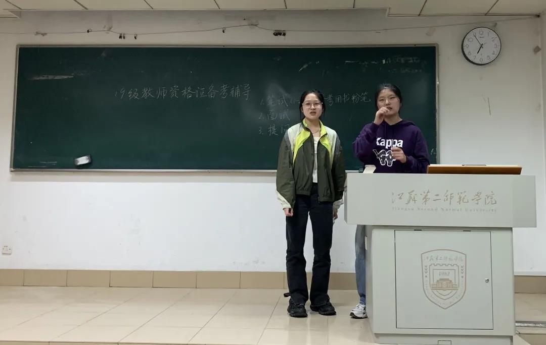 冬去春来,百花盛开。随着大学生活的推进,2019级学生不知不觉也将步入大三,作为师范生,美术学普本班和定向班也即将面临教师资格证考试。3月29日晚,教师资格证考试经验分享会在教二101举行,18级美术学普本班王姣和郭乃芙同学主讲。