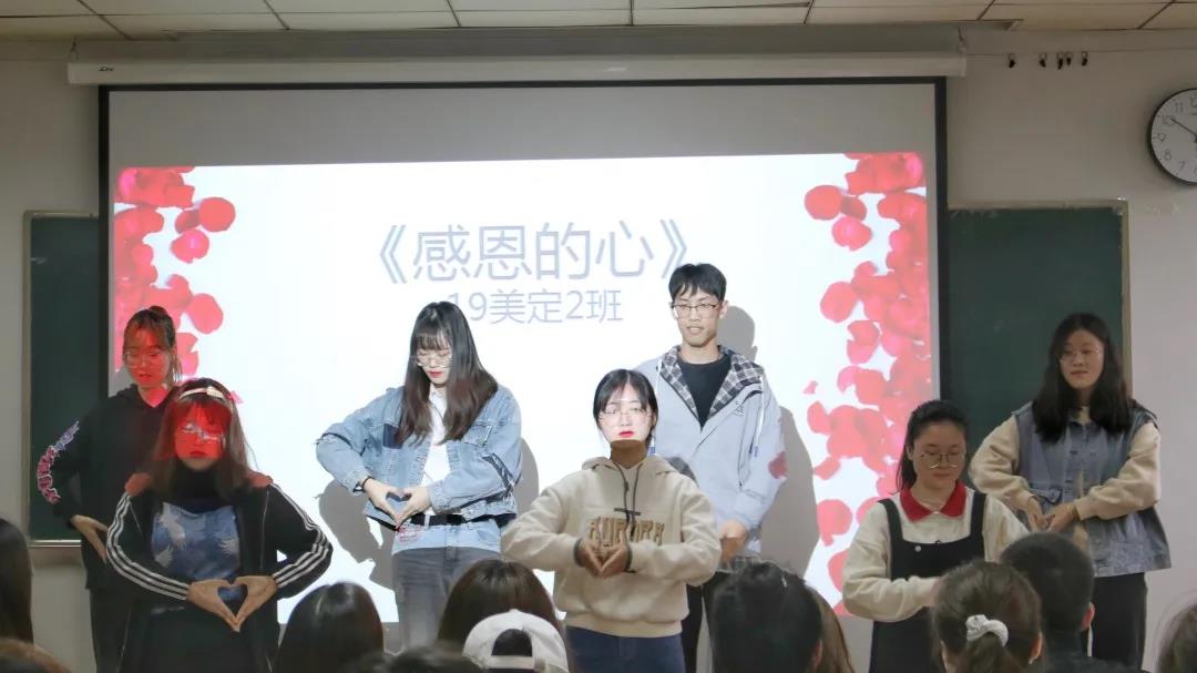 接下来19美定2班和19美普《感恩的心》用歌曲配上肢体语言,用手传达真情,激励着大家无论何时都要懂得感恩;