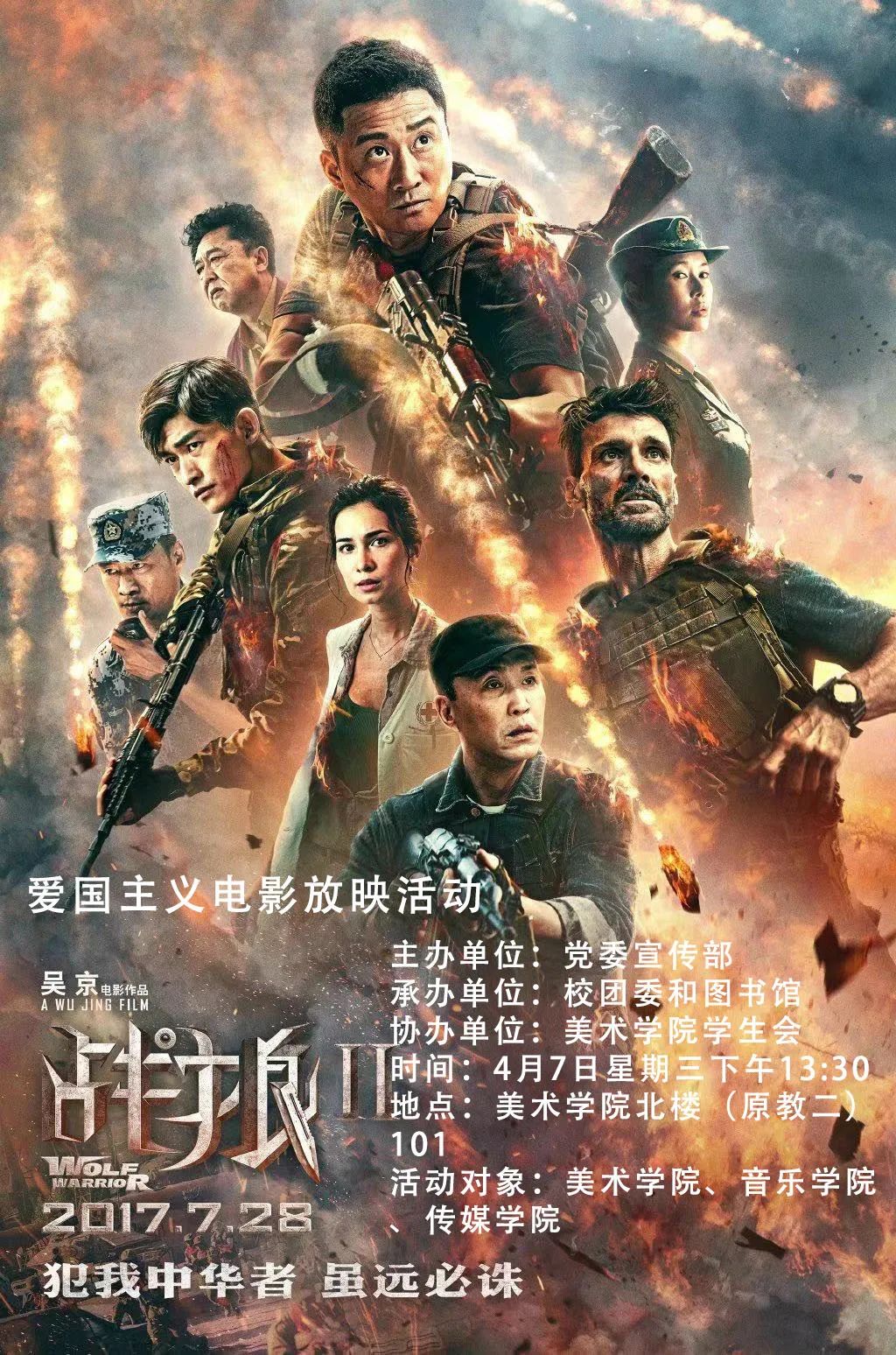 为了庆祝中国共产党成立100周年,弘扬爱国主义、英雄主义精神,铭记历史和传承英雄事迹,进一步增强当代青年学生的爱国主义情感。2021年4月7日下午1点30分,江苏第二师范学院美术学院分团委、学生会在草场门校区美术学院北楼101教室举办爱国主义电影《战狼2》放映活动。