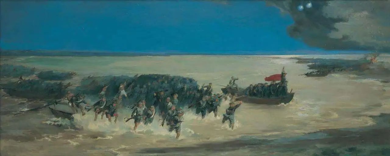 画作中解放军战士,人马齐集、密密层层,黄河蜿蜒流淌像一条巨蟒,解放军战士踏上蟒背一跃飞过天险,刘邓大军的英雄气概被,展现得淋漓尽致。