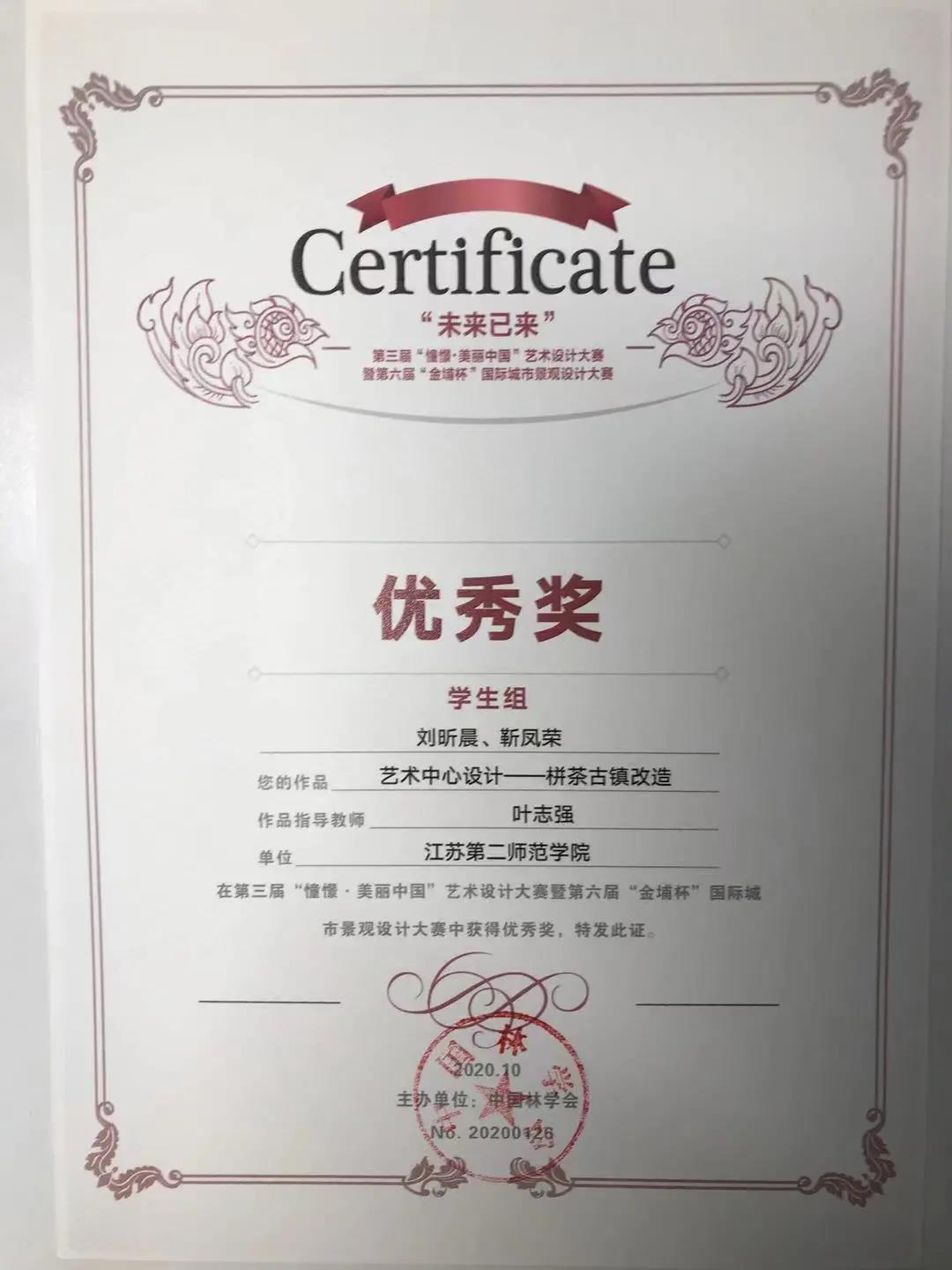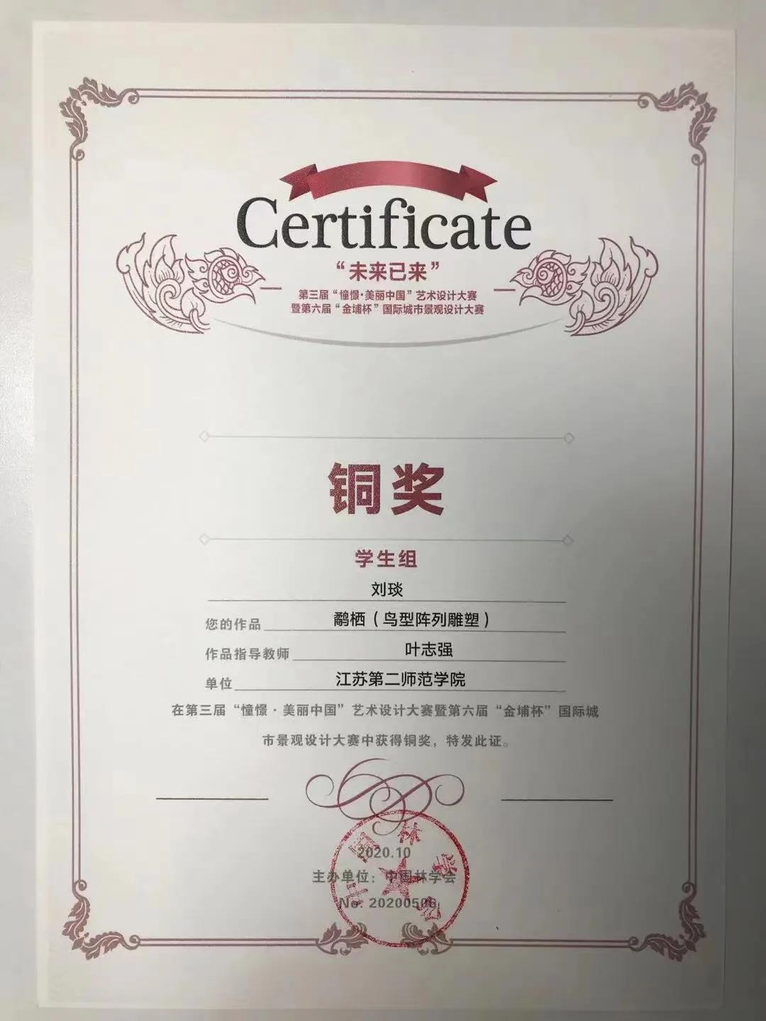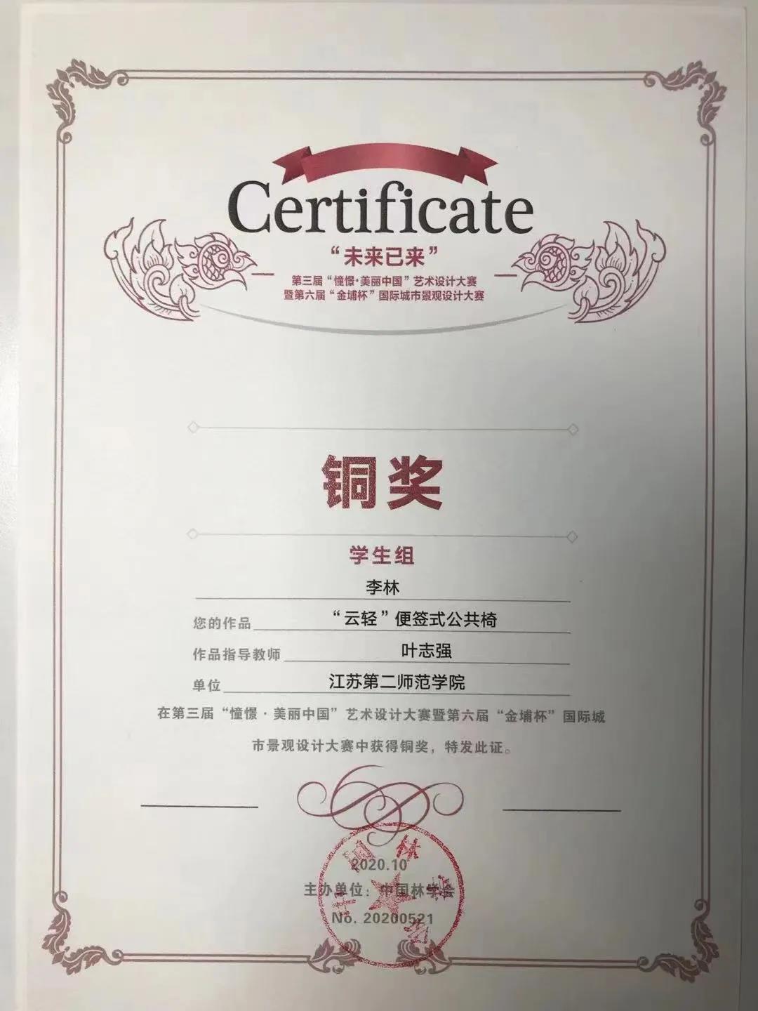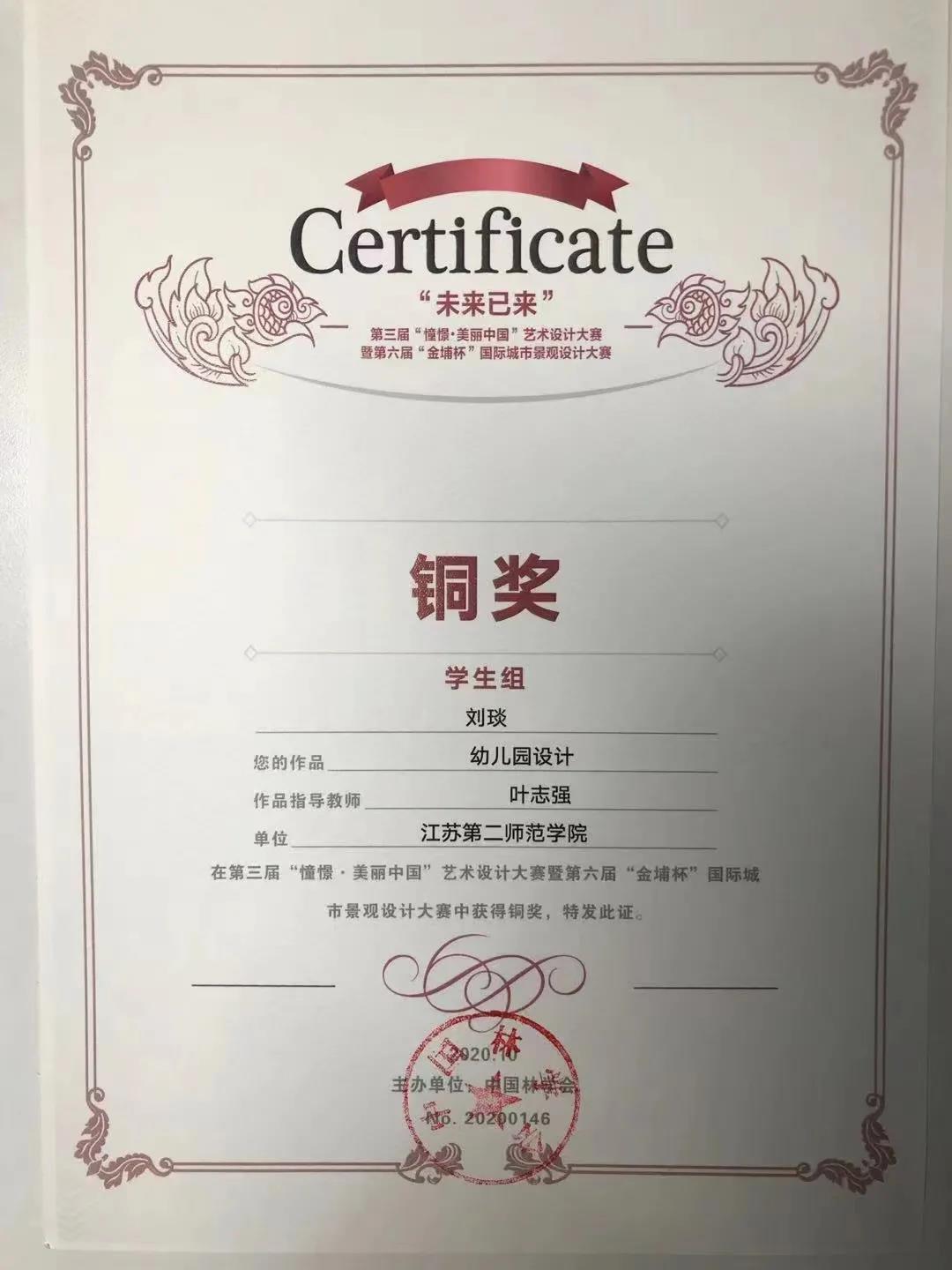 “憧憬·美丽中国”艺术设计大赛暨“金埔杯”国际城市景观设计大赛是由中国林学会、南京林业大学主办的,中国农林高校设计艺术联盟、江苏省风景园林协会、江苏省科普美术家协会协办的关于美丽中国与国家级比赛。在本次赛事中,江苏第二师范学院美术学院环境设计专业多名同学在老师的指导下喜获佳绩,共获铜奖三项,优秀奖一项。