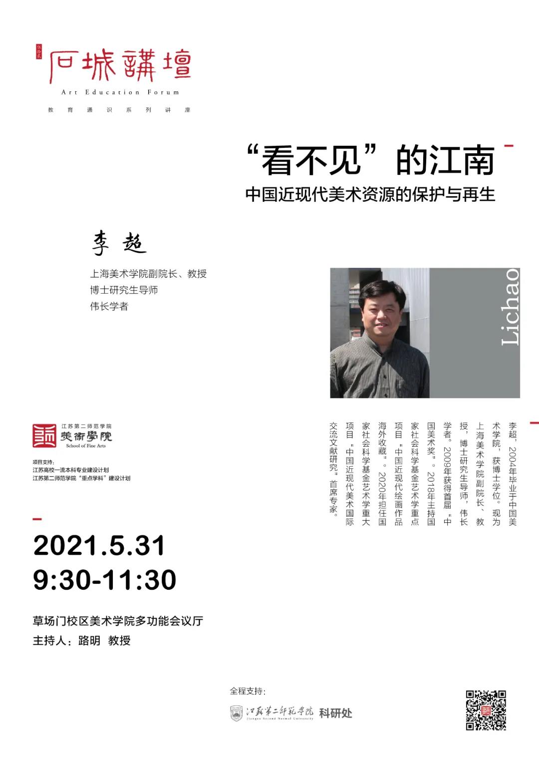 2021年5月31日上午,上海大学美术学院副院长、博士生导师、伟长学者李超教授应邀来我校草场门校区,为美院师生作题为《“看不见”的江南——中国近现代美术资源的保护与再生》学术讲座。李超教授2009年获得首届“中国美术奖”,2018年主持国家社科艺术学重点项目“中国近现代绘画作品海外收藏”,2020年担任国家社会科学基金艺术学重大项目“中国近现代美术国际交流文献研究”首席专家。讲座由美术学院路明副院长主持。