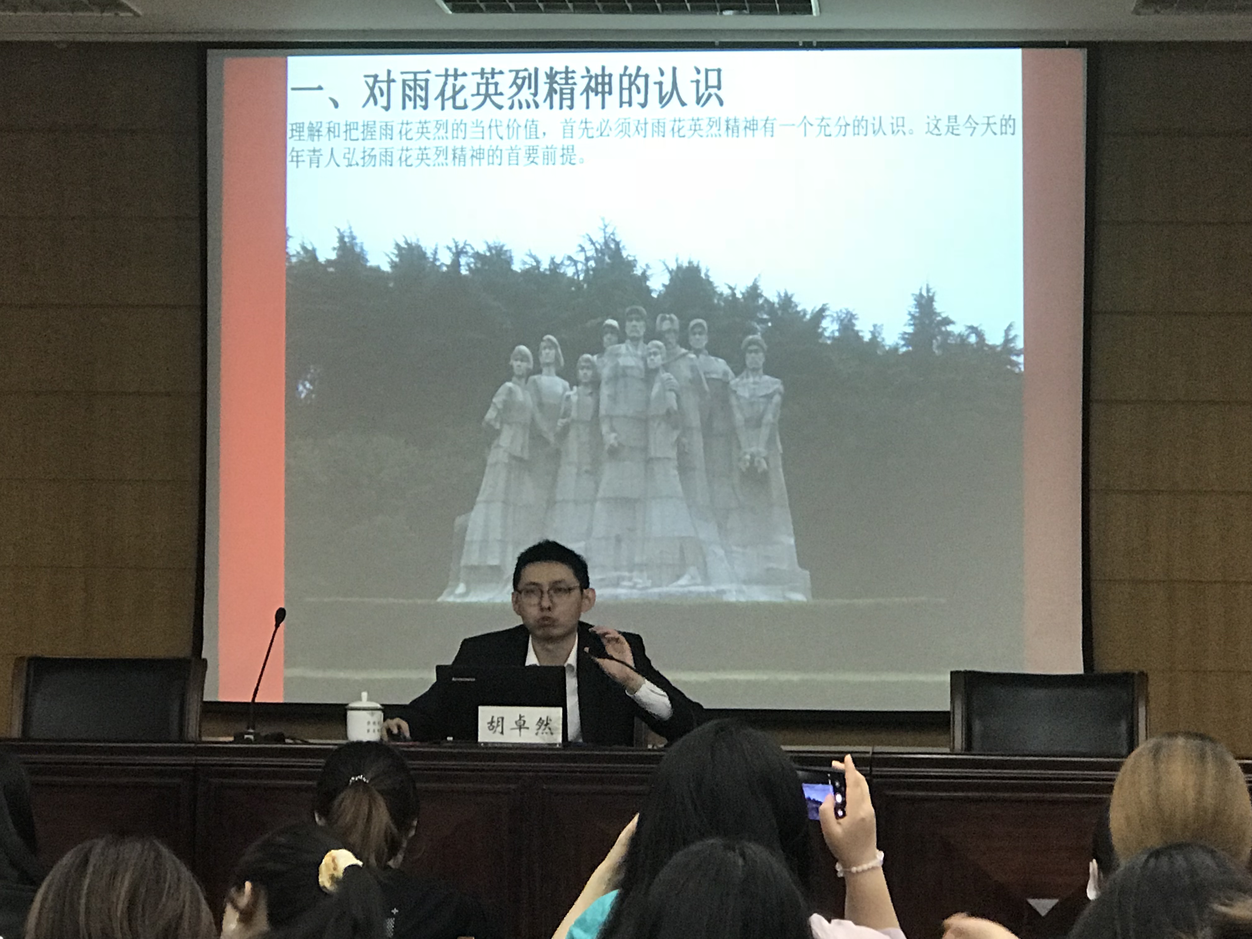 胡卓然从历史和现实两个层面分析了雨花英烈精神的历史地位,阐明了当代青年人弘扬雨花英烈精神的现实意义。他结合作曲家赵良璋的英雄事迹,讲活历史故事、用活红色资源,引导党员师生学习英雄的优秀品质,强化思想自觉与行动自觉,更深入地理解中国共产党为人民谋幸福、为民族谋复兴的实践意义,在今后的学习和生活中把脚下的征途走得更稳更好。