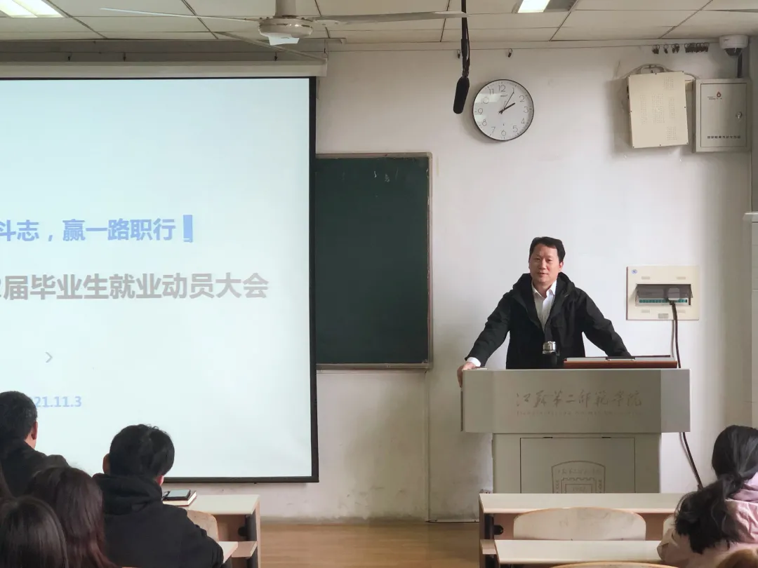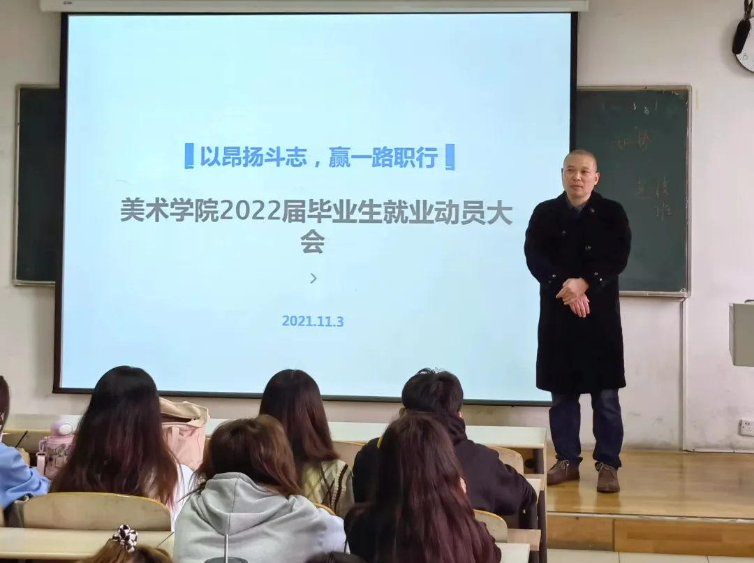 为了更好引导2022届毕业生选择就业方向,把握就业机会,11月3日下午2点整,江苏第二师范学院美术学院在草场门校区美院北楼304教室针对专转本同学举行毕业生就业动员大会。本次大会由美术学院就业专员章砚文主持,校招就处副处长黄晓波、美术学院党总支书记丁莹、副书记孙仕荣及班主任张韶明为同学们做相关指导。