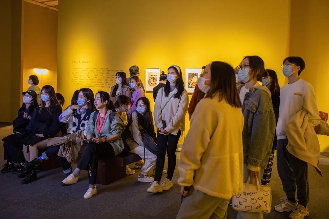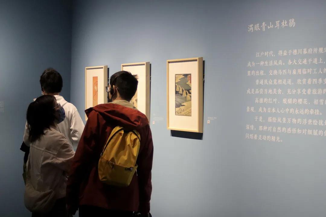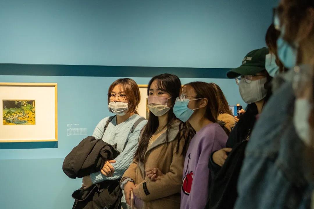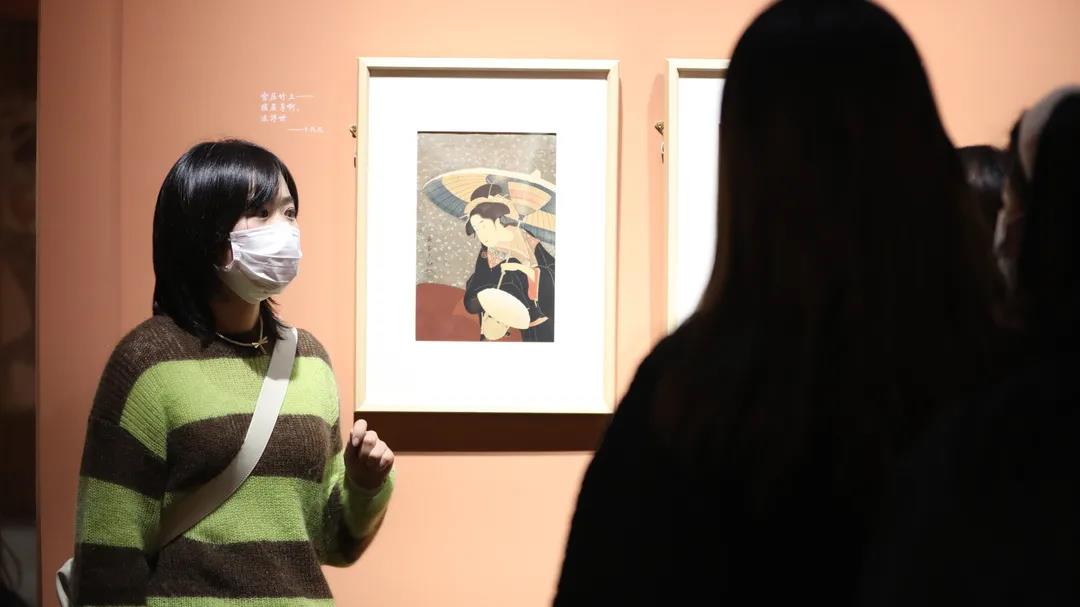 付晓彤老师以展品的时间顺序、画家创作风格为线索,对重要作品的创作特色以及背后的故事作了介绍,在互动中让同学们体会浮世绘的艺术美、诗意氛围和江户文化。在导览过程中,付老师生启发同学们思考一些有趣的问题,如在看到美人图部分,请同学们注意关注从铃木春信到鸟居清长再到喜多川歌麿的美人有何区别;讲到江户时代的着衣时尚,浮世绘类似于今天的“小红书”,传递着时髦女性的穿搭经验。浮世绘制作愈发精美,与其作为礼物互赠友人有密切关系。