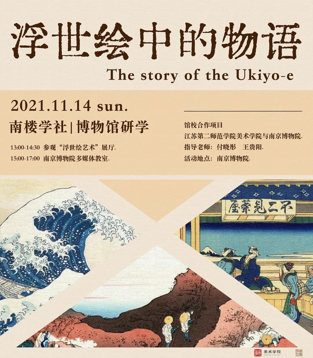 2021年11月,南楼学社在南京博物院开展博物馆研学活动。南京博物院是江苏第二师范学院美术学院的馆校合作单位,依托南京博物院的展览开展相关的教学研究活动,开拓第二课堂。本次江苏第二师范学院美术学院走进南京博物院,是以“浮世绘艺术”展为切入点,开展“浮世绘中的物语”系列课程。该课程指导教师是南京博物院社会服务部王贵阳、美术学院教师付晓彤,南楼学社二十三位同学参与其中。