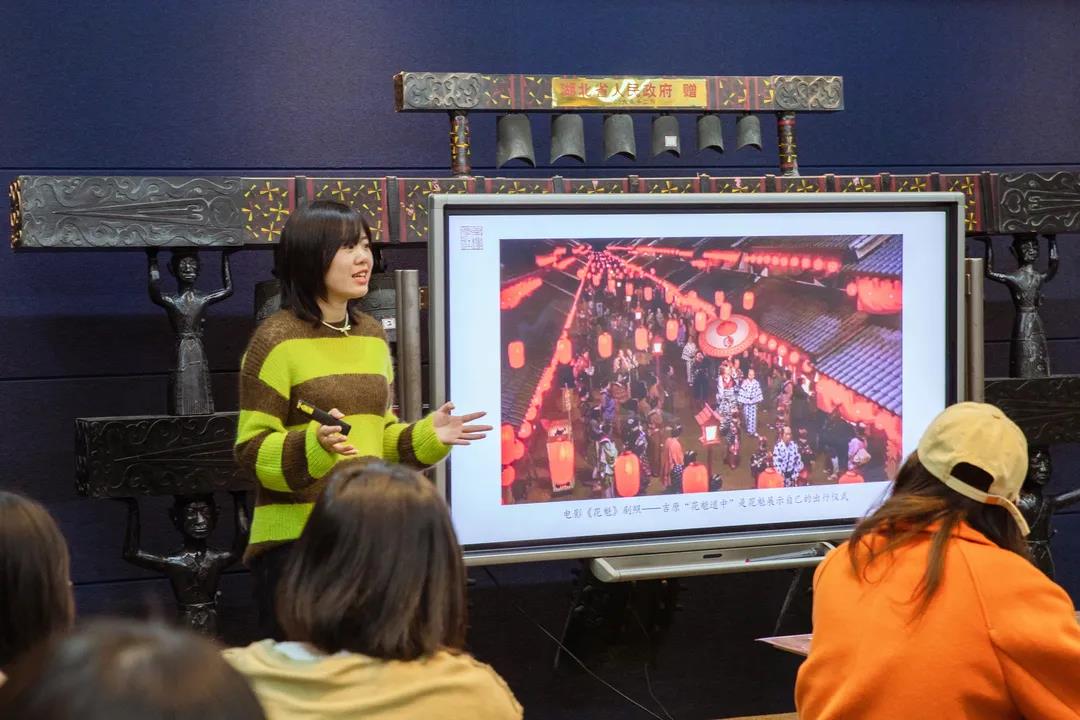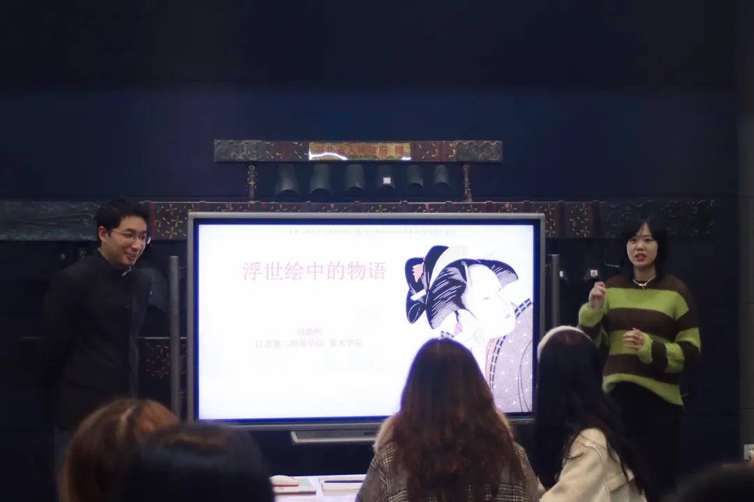 观展结束后,付老师在南博教室对浮世绘艺术的文化内涵、样式特征做了归纳和总结。讲解了作为一种平民艺术浮世绘的价值,以及浮世绘是如何传达日本江户时代的生命意识和文化心理等问题。并图文并茂重点分析了浮世绘艺术的非对称性构图、抽象的装饰性和明亮的色彩等样式特征。