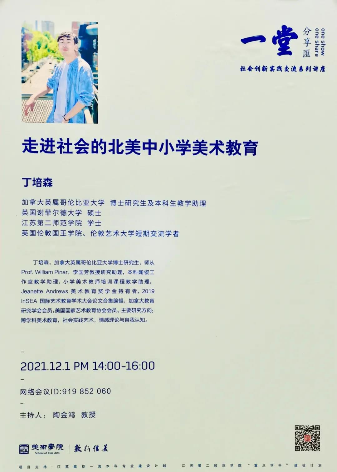 2021年12月1日下午两点,江苏第二师范学院美术学院特邀我院优秀校友、加拿大英属哥伦比亚大学博士研究生及本科生教学助理、英国伦敦国王学院、伦敦艺术大学短期交流学者丁培森,于草场门校区美术学院北楼304开展题为《走进社会的北美中小学教育》线上讲座。20级美术定向及美术普本专业的全体同学参加本次讲座,讲座由美术学院副院长陶金鸿主持。
