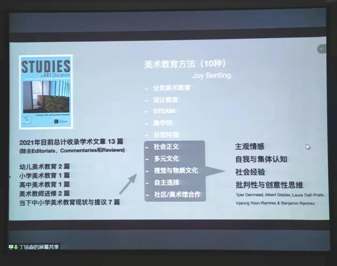 随后,丁培森老师向我们介绍了加拿大的各种艺术期刊,2021年目前收录的各类关于美术教育的学术文章,并且总结了文章中提出的10种美术教育方法,着重强调了要引导学生养成批判性与创意性思维,要从情感体验当中去思考。接着,丁培森从理解、实践、认知这三方面向我们展示了英属哥伦比亚大学课程大纲模型,并举例介绍了不同年级的学生所要培养的能力、独立思考的能力。