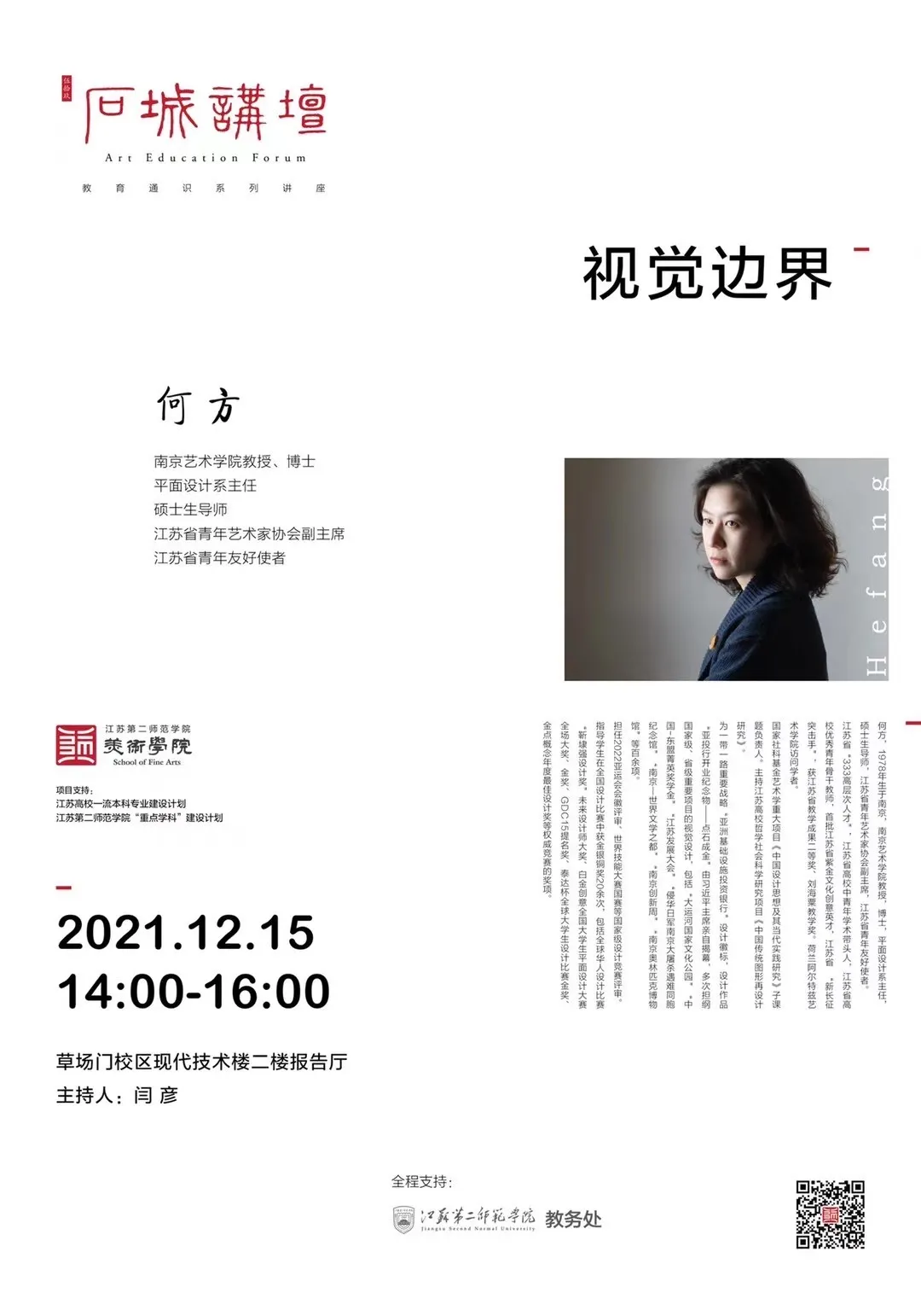 2021年12月15日下午两点,美术学院特邀南京艺术学院教授、博士,江苏省青年艺术家协会副主席何方老师来校开展《视觉边界》的讲座。美术学院视觉传达设计和环境设计专业的全体学生参加本次讲座,讲座由美术学院视觉传达设计系主任闫彦老师主持。