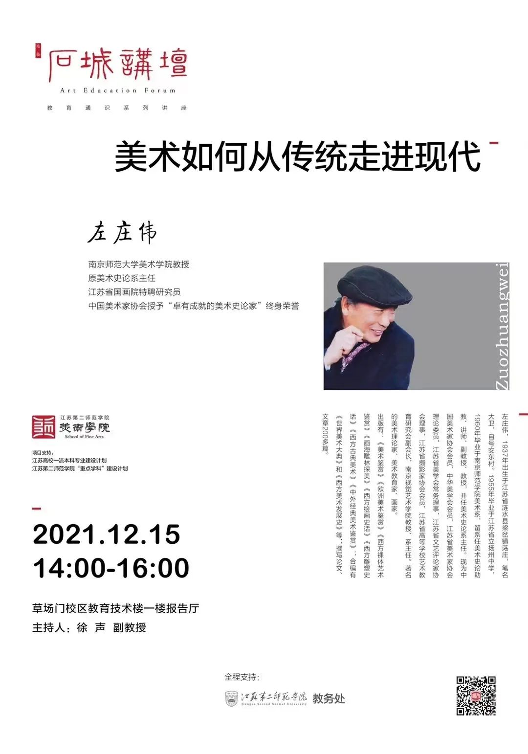 2021年12月15日下午,南京师范大学左庄伟教授应江苏第二师范学院美术学院邀请,在草场门校区现代教育技术楼一楼报告厅做了题为《美术如何从传统走进现代》的讲座,本次讲座由徐声副教授主持,美术学院19美术、21美转班学生参加。