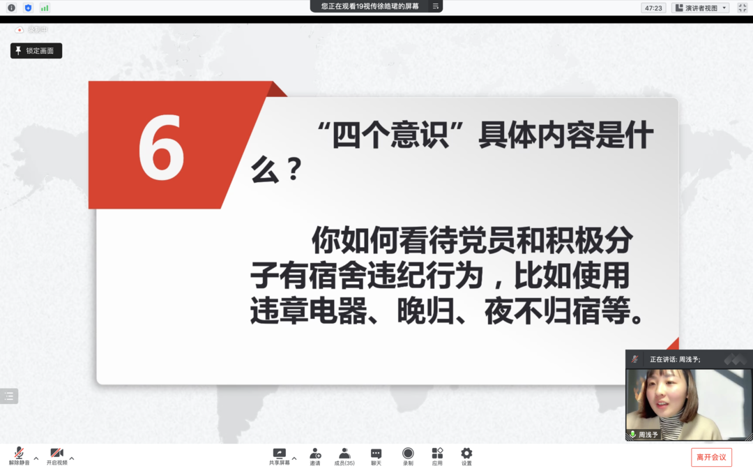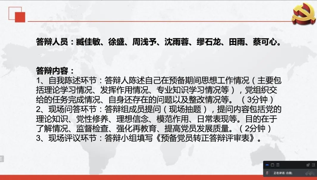 答辩会分个人陈述、现场问答、现场评议三个环节,答辩要求每人不少于十分钟。在个人陈述环节,拟转正的预备党员向党组织认真陈述自己在预备期内生活、学习、工作、思想等方面的情况,并检视自身存在的问题及整改情况。在现场问答环节,七名预备党员均展现出扎实的党的理论知识基础,并就日常表现、理想信念、时事政治、模范作用、人际关系、党性修养等方面接受了询问,根据自身情况进行详细阐述。答辩小组进行现场评议,对拟转正预备党员们的情况进行评价并公平打分,结果将作为预备党员转正的重要参考依据。