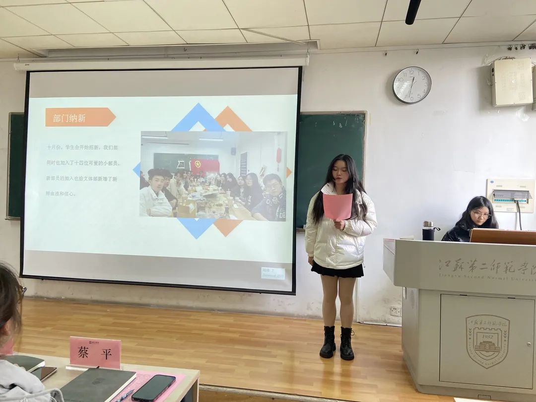 文体部部长王雨涵总结了这半年的工作内容及工作经验,并且反思了一些工作中的不足之处,她表示今后将以理解和信任为基地,勤劳和勇敢做屋顶,在团队协作的力量下,将文体部的工作开展的有声有色。