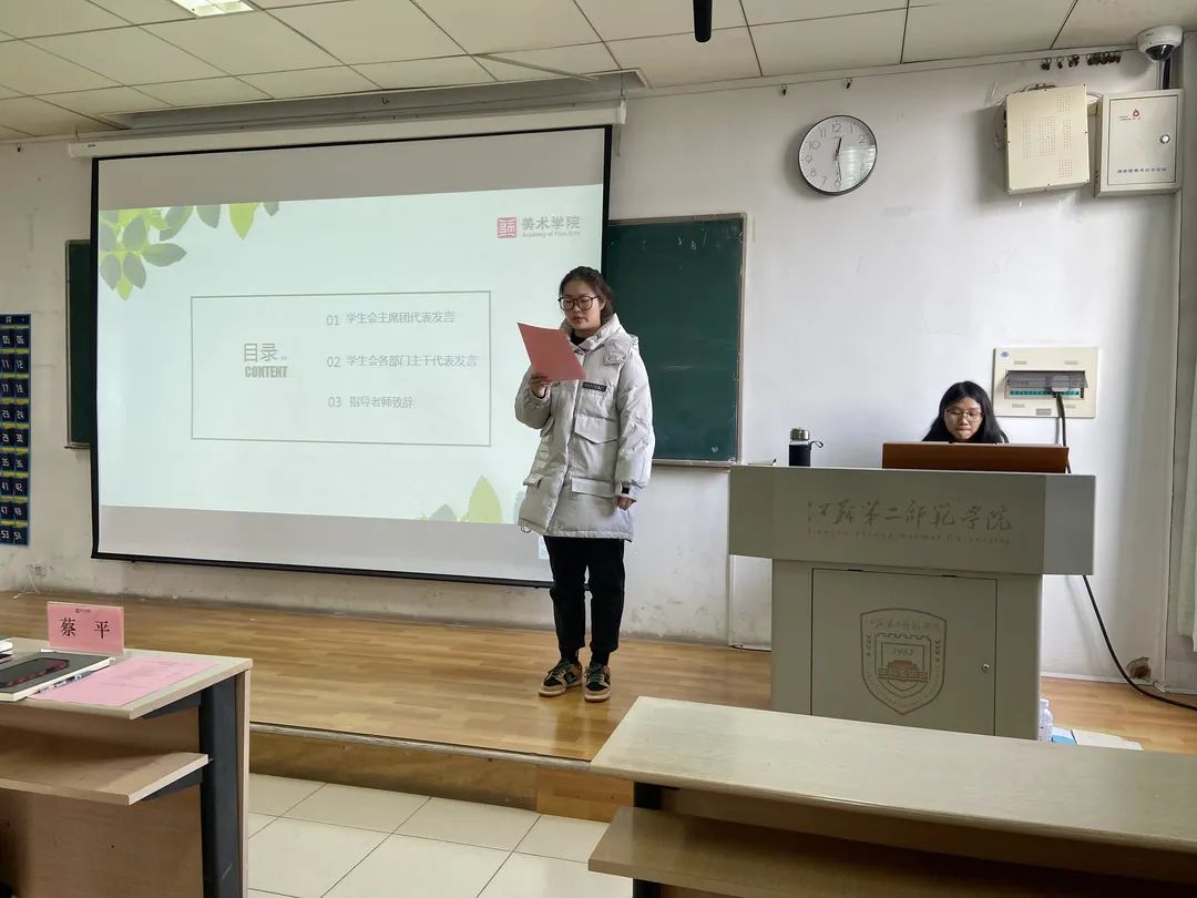 会议伊始,美术学院学生会副主席蔡平代表主席团发言。她首先带大家回忆了加入学生会这两个月来共同努力成功举办的各种活动,并表示正是有大家为学生会忙忙碌碌的身影,才使得这个大家庭充满温暖与活力。同时她也总结了在工作中发现的许多问题,并希望大家可以及时发现问题、解决问题。她希望大家秉承不忘初心方得始终的理想信念,铭记自己当初加入学生会时的那份初心,带领学生会不断创新不断突破,再创辉煌!