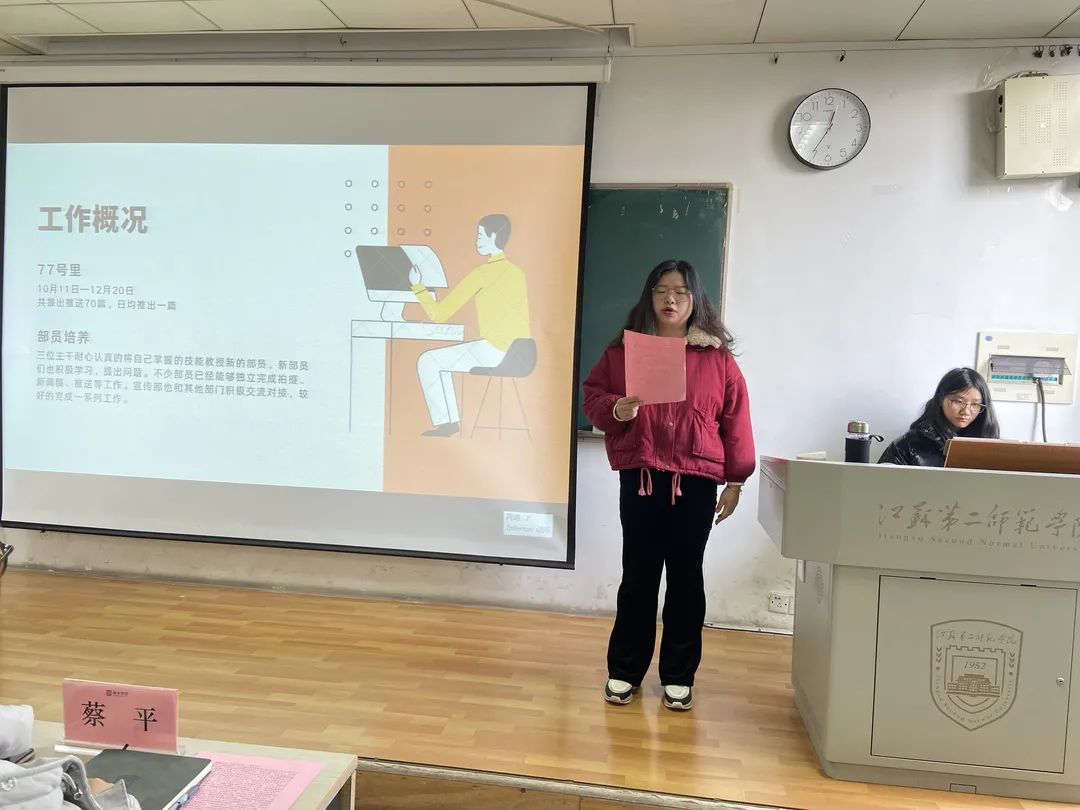 宣传部副部长刘卿云首先汇报了这半年微信公众号77号里的工作运营情况,肯定了新老部员的努力和汗水,同时总结了目前存在的问题以及未来工作计划。她希望宣传部的所有同学团结起来,心往一处想,劲往一处使,定能披荆斩棘,无往不胜,为学生会工作增光添彩。