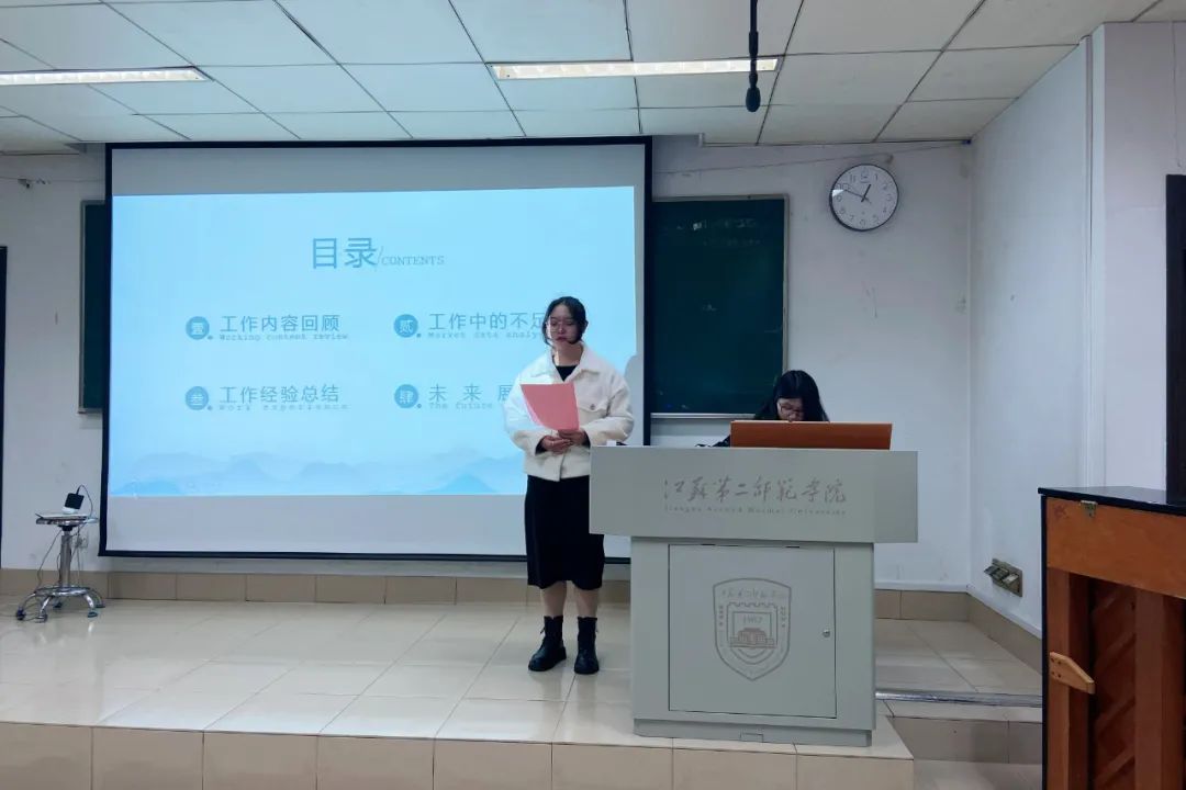 会议伊始,学生会副主席陈姝蓉代表主席团总结本学期工作,首先她肯定了同学们的工作、学习能力,接着她向大家提出几点建议:一、在工作中掌握方法和节奏,拎清主次,二、做事具有条理性,多思考;三、对于工作进行反思总结。